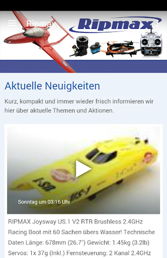 Ripmax Europe is the provider of high quality products around the Hobby Modellsport. Whether on land, on water or in the air - Ripmax provides for every need sophisticated technology at a fair price. The Ripmax headquarters are located in England, the German subsidiary operates under R / C Service & Support based in Pforzheim.