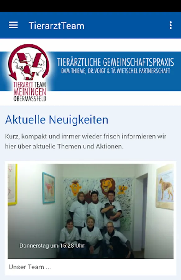 The Veterinary Gemeinschaftspraxis DVM Thieme, Dr.Voigt & vets Wietschel partnership introduces itself. For our team, your pet's health is always first. In our app you can find an overview of our veterinary services, your contact person and everything about our practice sites. They contain important information on your animal and we give useful advice. Whether health care, vaccination or a necessary surgery, they always have the most important information and contacts in stock. The perfect app for our customers with your animal patient.