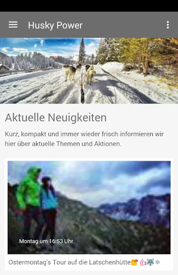 Huskypower Tirol is a Husky pack from Tirol. The app shows the dogs and their adventures, pictures, videos etc.