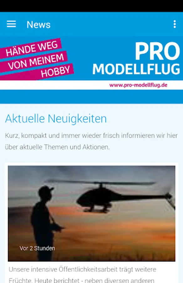 Under the auspices of the German model airplane Association (DMFV) have clubs, associations, trade fair companies, manufacturers, distributors and trade publishers on the initiative "Pro model airplane - hands off my hobby" together. With the news app model aviators and those interested to receive information on the current status of the campaign. Under the "News" tab press releases or information are published for talks with politicians and decision-makers from the economy. Anyone wishing to support the initiative, also via the direct link to the campaign website has the chance.