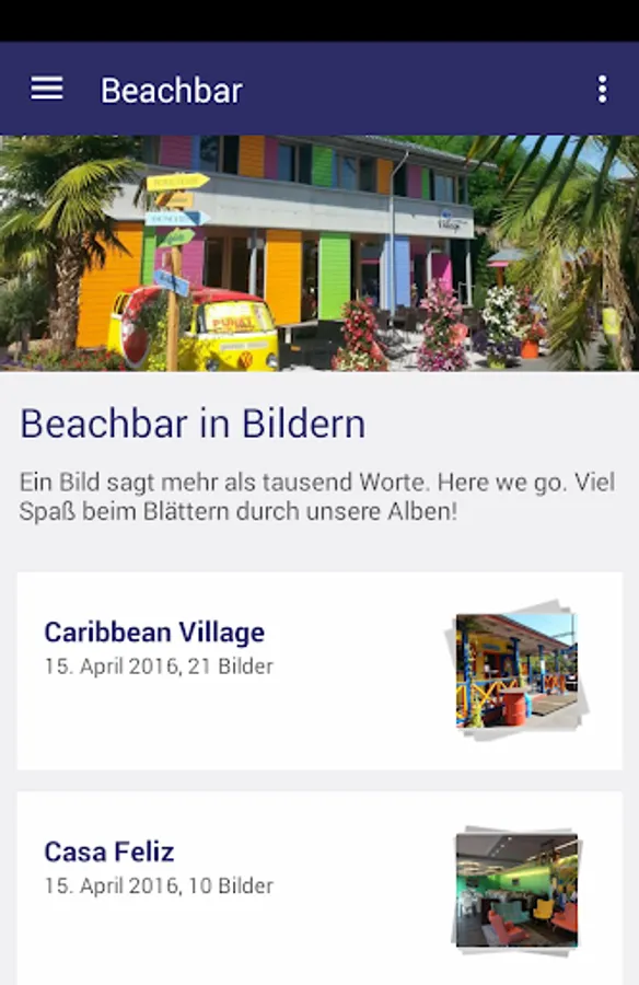 The Caribbean Village is a small Caribbean oasis at Sempachersee in Nottwil LU / CH. With the cool beach bar, the Beach Shop and Surf School. With this app you will informed about our activities and can write to current photos get an impression of our system. Thomi and Andy and the whole team of the Caribbean Villages Nottwil glad renters welcome and look forward to a common, unforgettable summer with many sunny days!