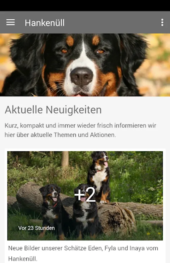 Since 2004 we have been breeding Bernese Mountain Dogs in Swiss Mountain Dog Club (SSV e.V.) as part of the Association of the German Kennel Club (VDH) and now offer this application to all interested parties the opportunity to always get the latest information and pictures about our breeding. Keep up promptly the exciting events of our litters or browse through the galleries and discover the fascination of a Bernese Mountain Dog from Hankenüll.