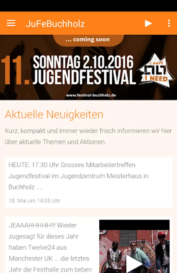 The Youth Festival Buchholz is held annually Musical Band Festival of Evangelical Youth Annaberg. With this app you will receive a daily basis all information about our latest events and the bands respectively occurring. Also here photos and small videos of previous events are passed. The best thing is that you also stay connected with our app in contact and meet personal consultations locally can. We hope you enjoy our app!