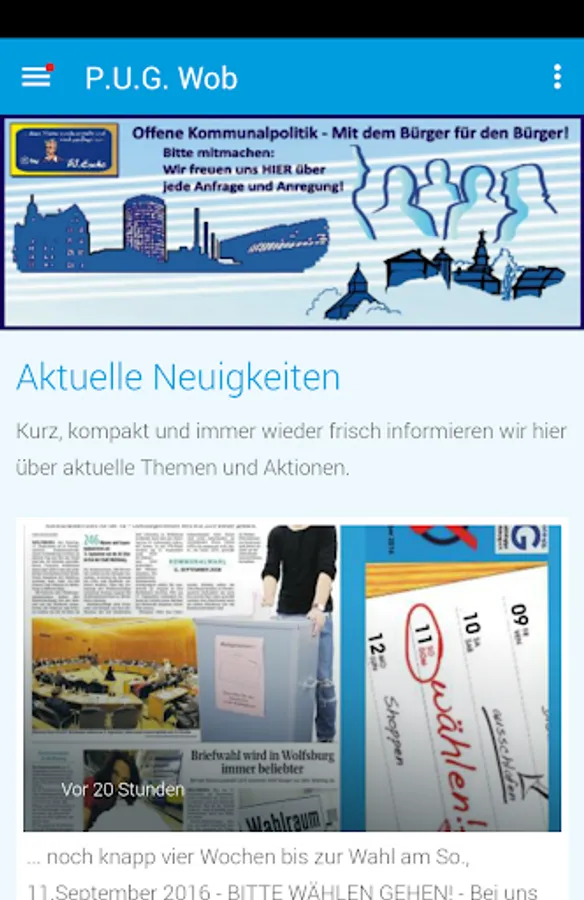 The PUG - party politics Independent Community Wolfsburg e.V. is a free voter community, which was founded in Fallersleben in 1984 and currently with 11.9% and six seats representing the third strongest force in Wolfsburg City Council. For more than 35 years applies to us the principle "with the citizens for the citizens". With this app, we want to inform you about our political work in the City Council and the local councils to introduce our candidates for the local elections in 2016, and on other activities of P.U.G. to report.