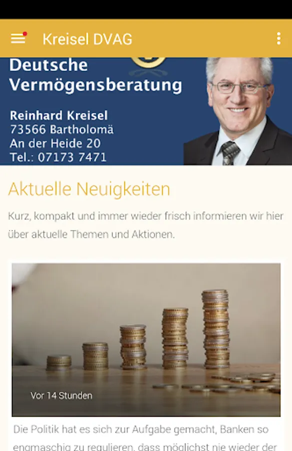With this app you will get daily new financial advice and stay with the integrated "Magazine" on news and trends on the subject provision and finance, and success and knowledge up to date! Contact me like directly via app when you want to make an appointment with me. I look forward to meeting you personally.