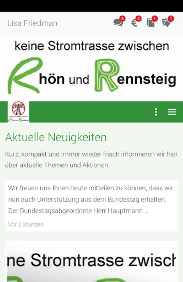 The citizens' initiative "No current route between Rhon and Rennsteig" is the first contact for citizens when it comes to information on the planned Südlink, a current path through our region geht.Unser professional organizational team is available to citizens with advice and act to the side and requires a fast and permanent way of information, which this app is to fulfill.