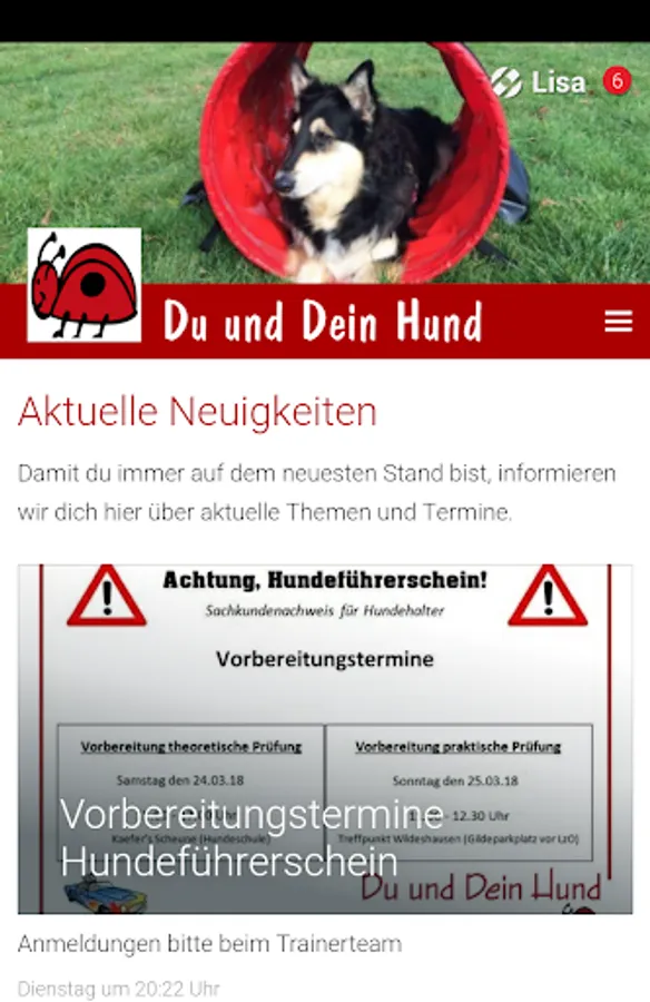 About App get their information on the contents, dates and prices of our courses and events offered as well as special activities such as polls and photo contests. In addition, you have the chance to you to gain an insight into the dog school life and our employment program through our photo albums. Of course you can contact us via the app directly and make an appointment or you sign up for an event. We look forward to seeing you!