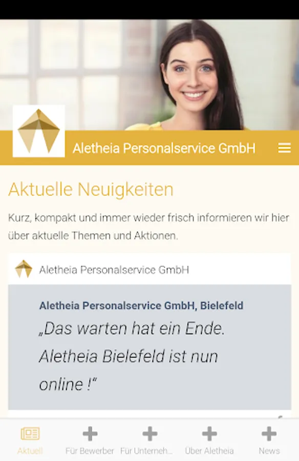 The Aletheia Personal Service GmbH is the reliable agency for employee allocation throughout East Westphalia-Lippe. Since April 2011 we have an office in Gütersloh and in January 2016 another in Bielefeld. The app provides current articles and news about the Aletheia Personal Service GmbH and contains information for candidates and companies.