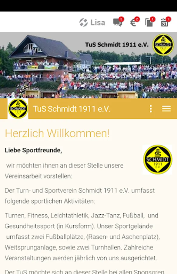 Gymnastics, fitness, athletics, jazz dance, football, health and sports (in course form). Our sports field comprises two soccer fields, (grass and clay court), long jump system, and two gyms. With our app you are always informed about the numerous current events of our sports departments as well as news about the club.