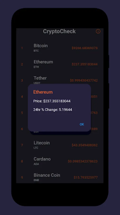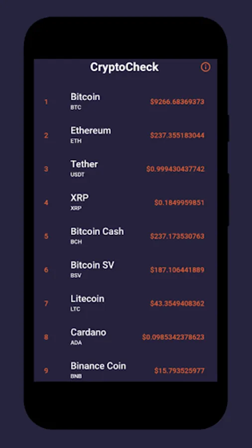 Cryptocheck is a cryptocurrency tracking app that provides users with the prices of the top 50 coins including: "Bitcoin", "Ethereum", "Litecoin", and more! Be on the look-out for new and exciting features coming soon!
