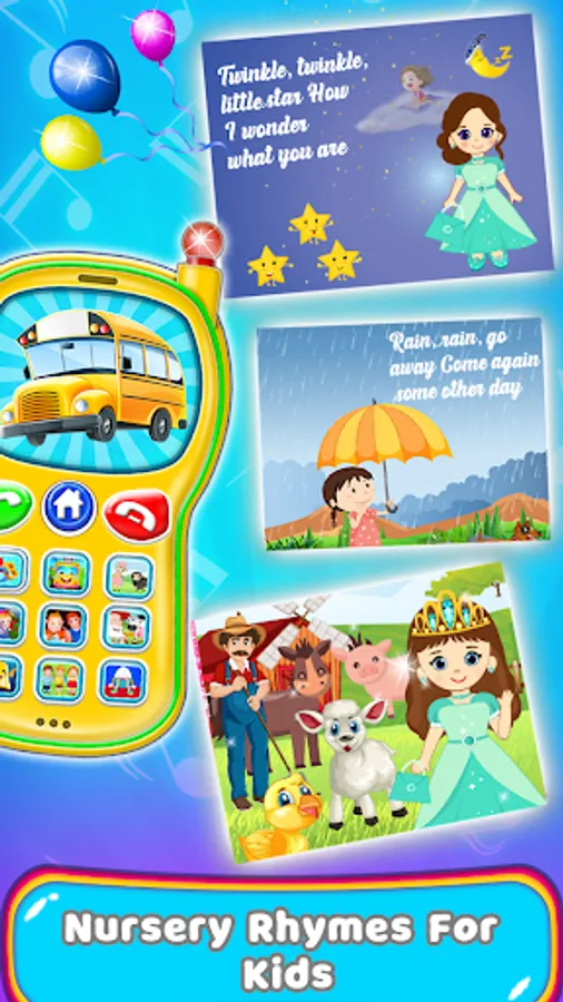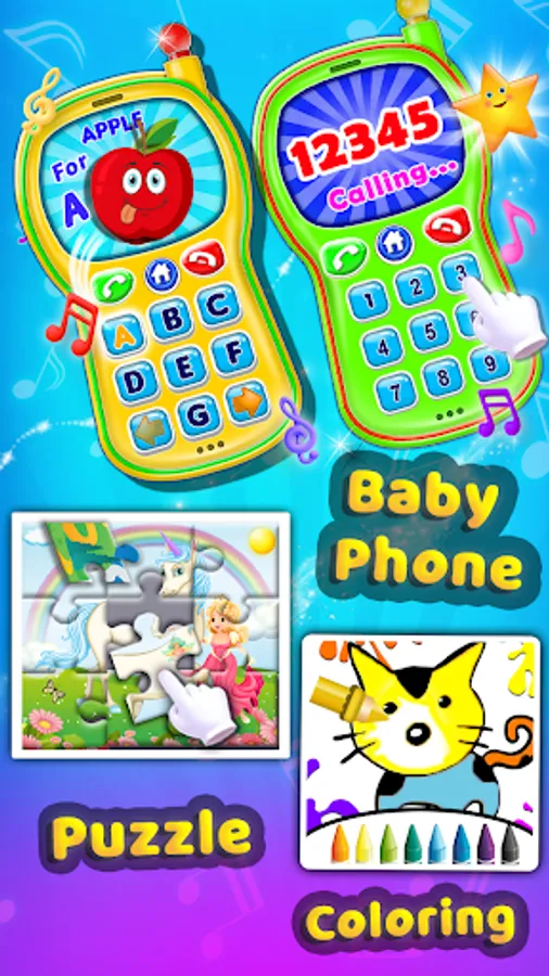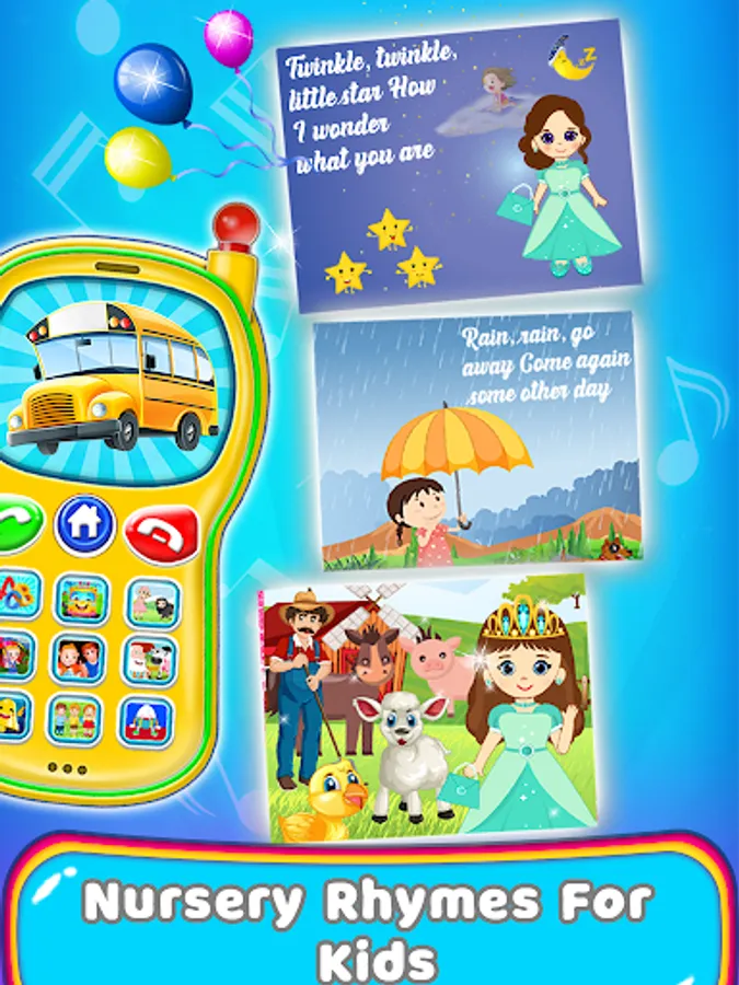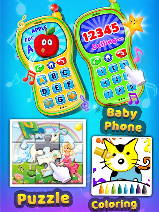 Baby Phone help your child to interact with educational activities like learning alphabet, colours, Animals, Shape, Vehicles with Sound, Musical Instruments Like piano and xylophone.Playing Educational phone your toddler will train fine motor skills and develop various mental activities such as memory, logics and attentiveness. Our Educational phone for kids with a lively and colorful interface is suitable for little kids