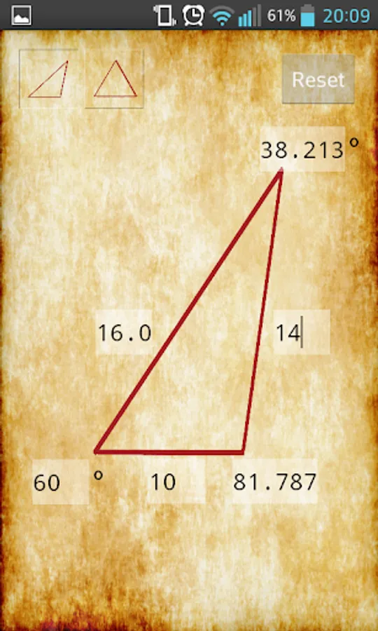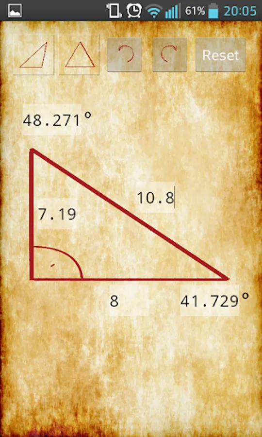 Enter two parameters (lengths or angles) for right-angled triangle or three parameters for scalene triangle. The app will do all the rest.