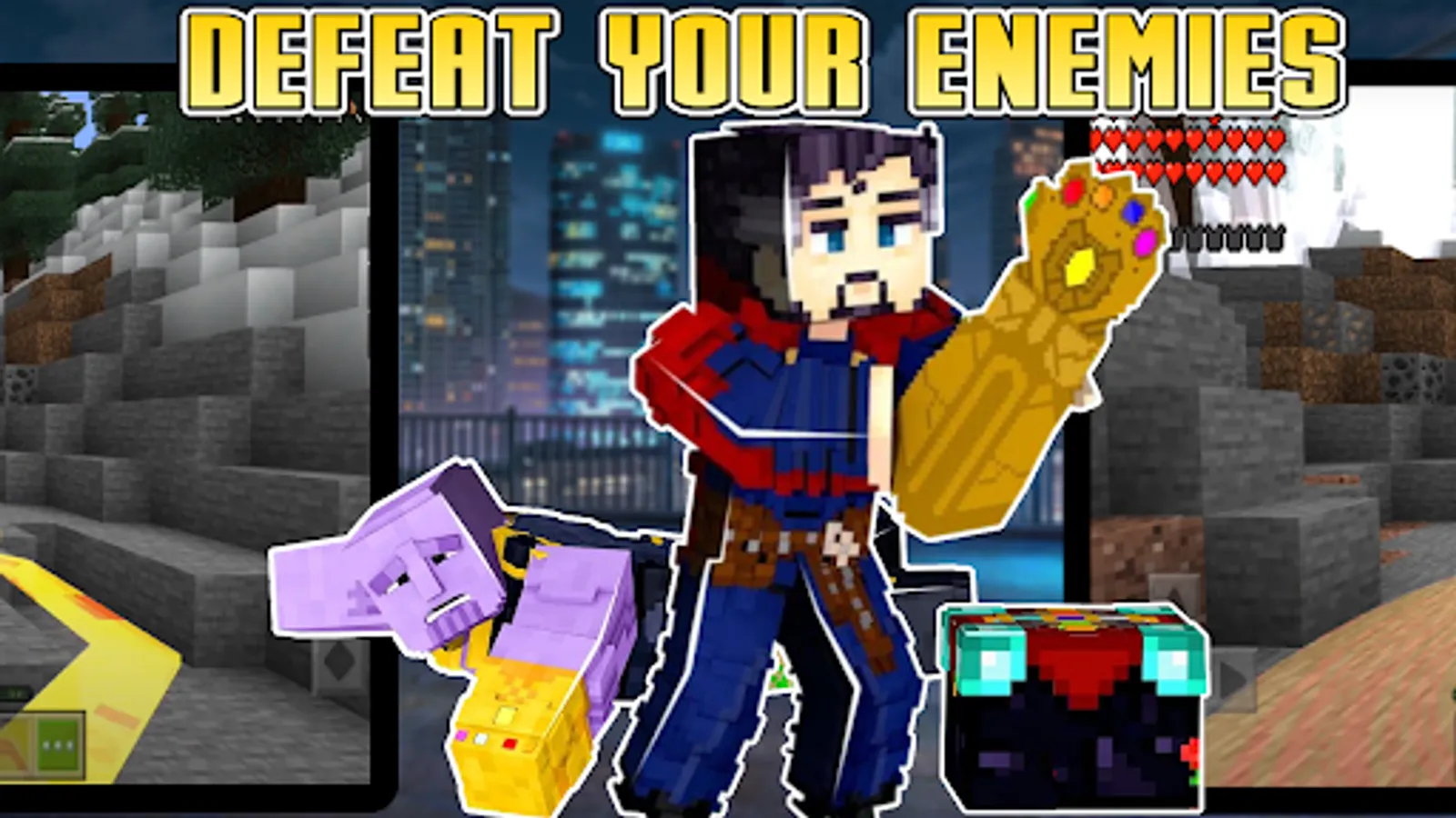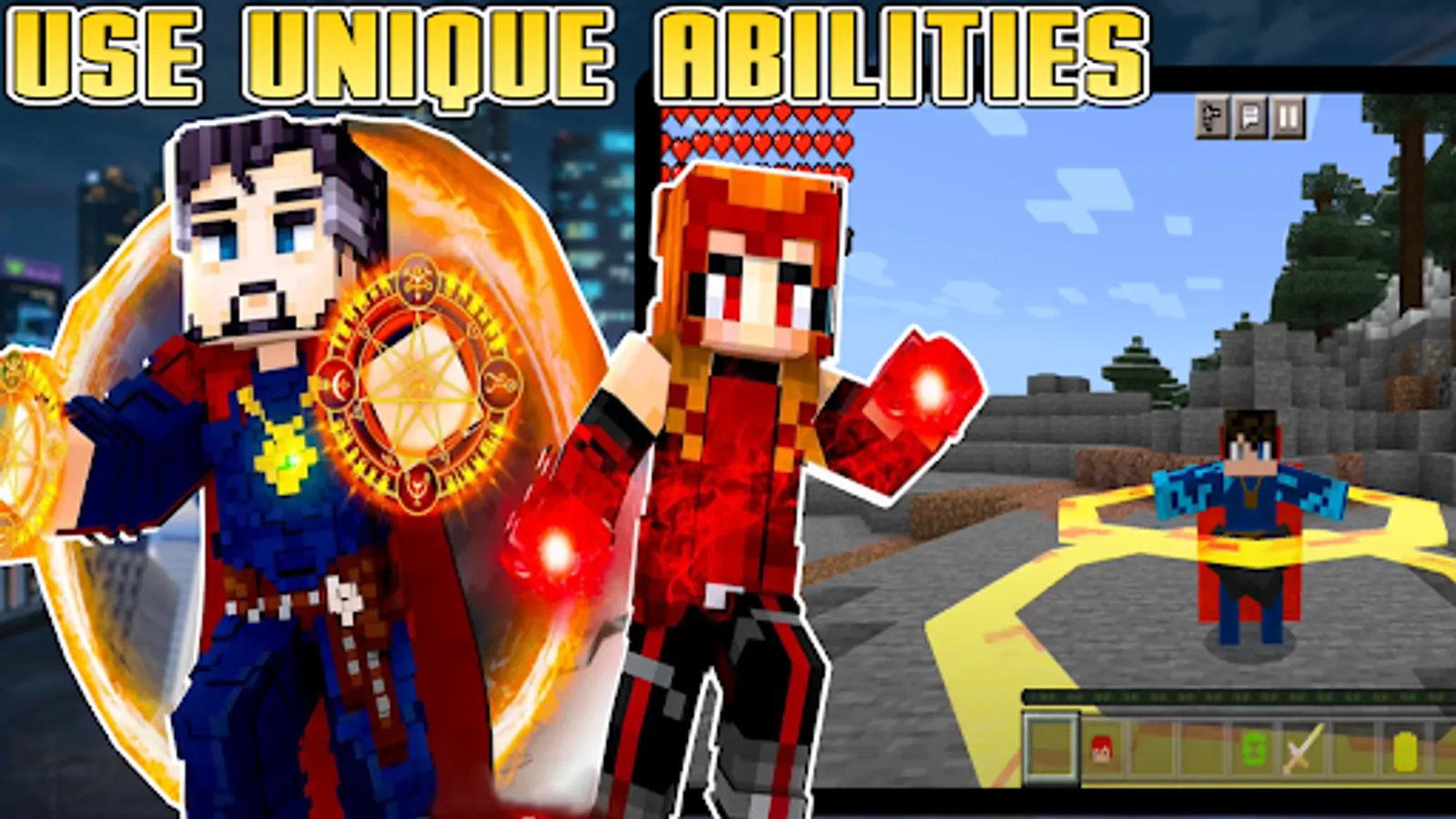 Play as the legendary character of the superhero universe in Minecraft PE.