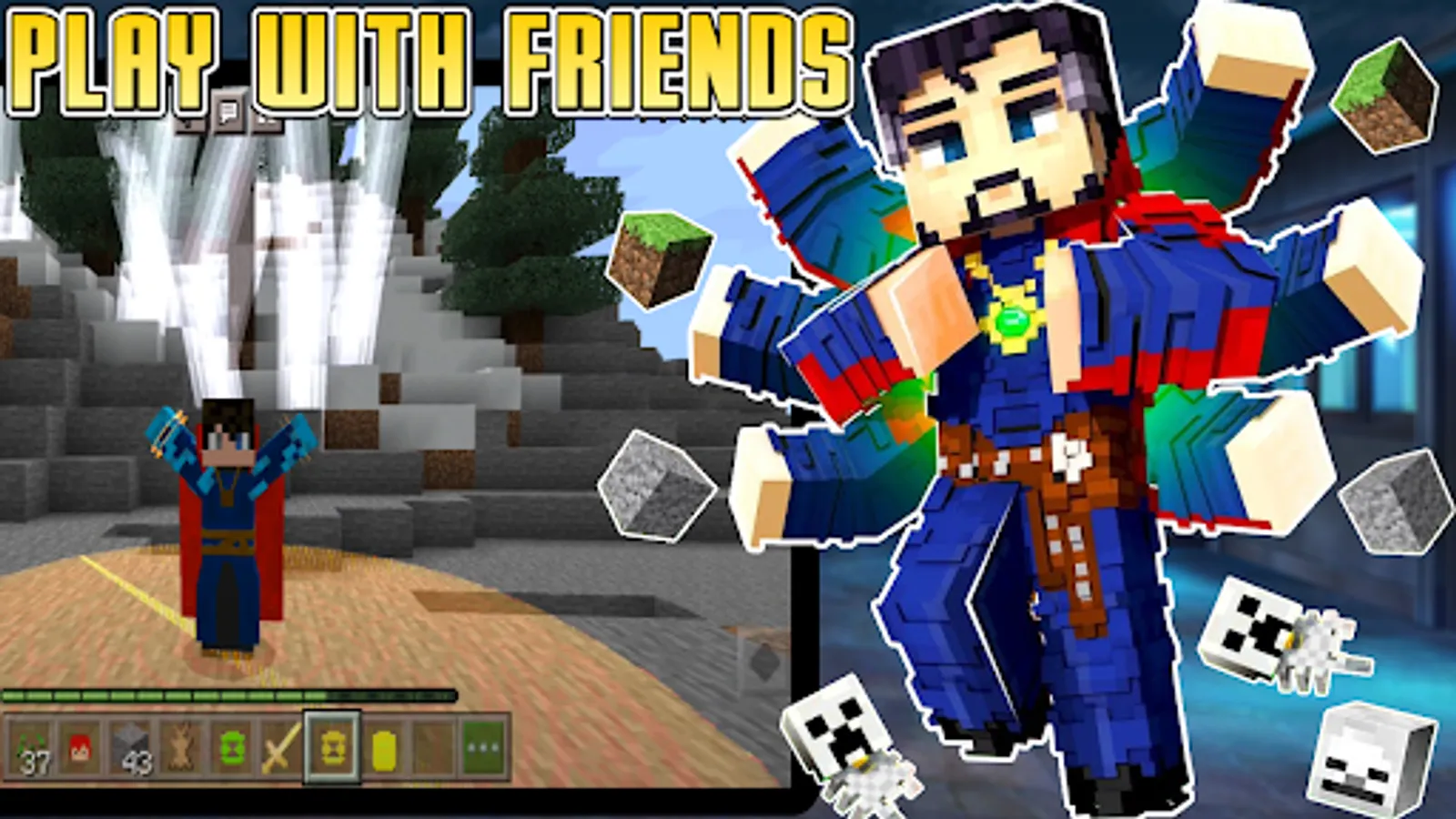 Try on Doctor Strange's costume and cape in Minecraft Pocket Edition, immerse yourself in the exciting atmosphere of the popular superhero game.