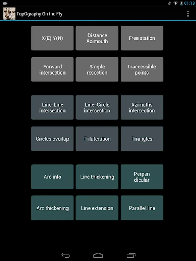 Topography On the Fly is a suite of land surveying tools. It allows you to have complex surveying calculations on the field quickly with maximum accuracy. The design is as simple as needed under work pressure. The advantage is that can be used only with a simple total station or additionally with more complex instruments and gps.