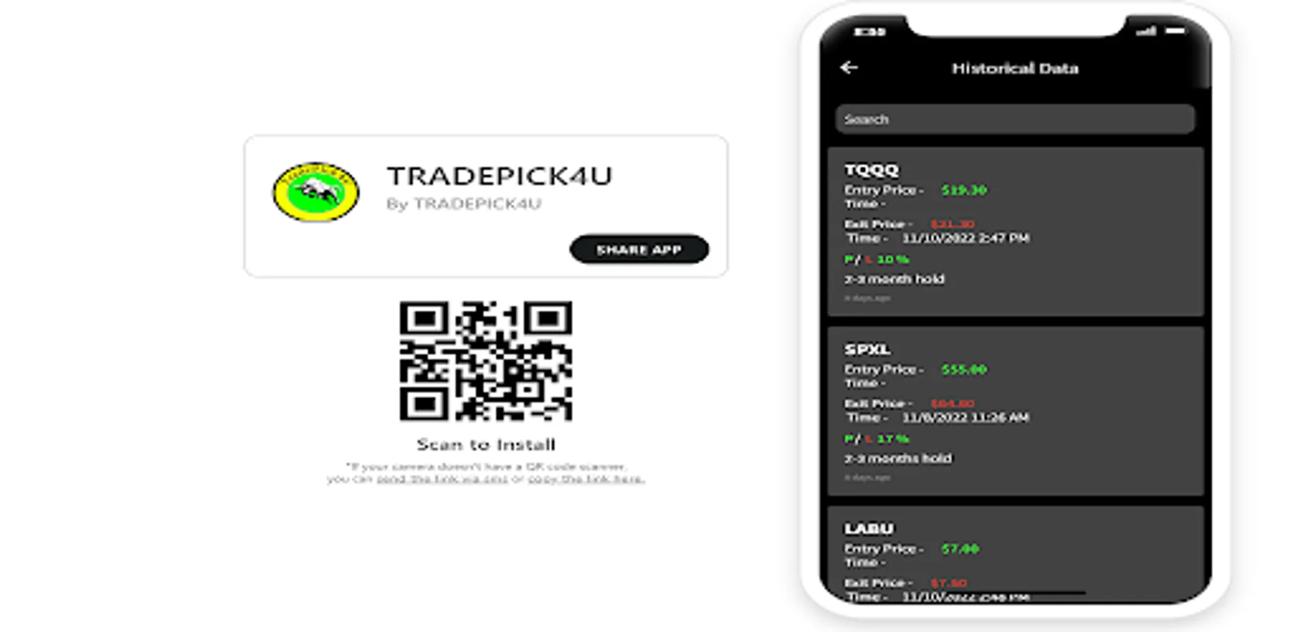 TRADEPICK4U IS NOT INTENDED TO BE TRADING OR INVESTING ADVICE. ALL DATA IN THE APP IS STRICTLY PERSONAL OPINION.ALWAYS DO YOUR OWN DUE DILIGENCE USING MULTIPLE SOURCES OF INFORMATION AND/OR SEEK THE ADVICE OF A LICENSED PROFESSIONAL BEFORE TRADING OR INVESTING.