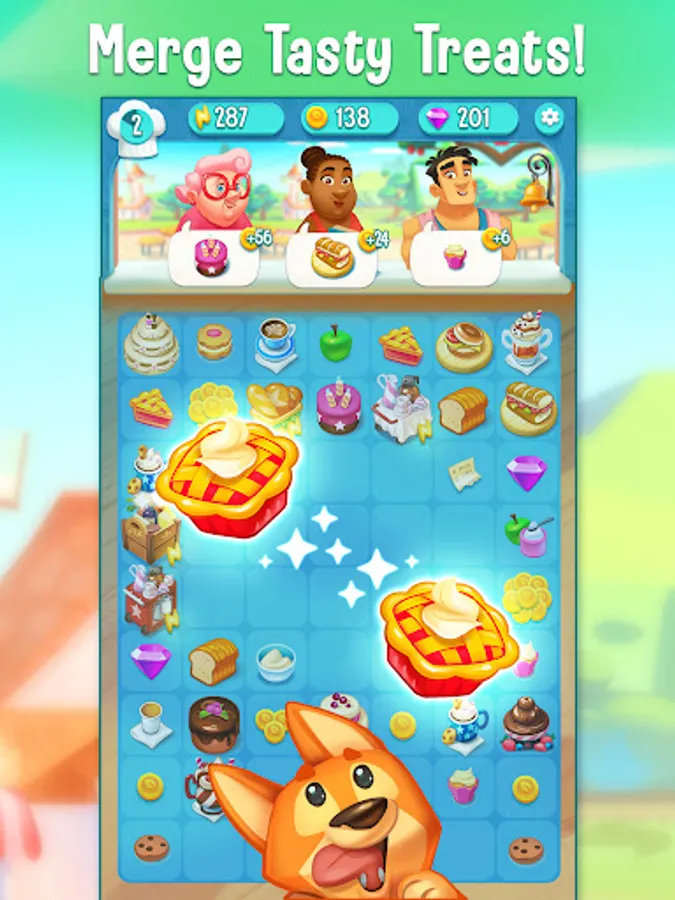 Merge cakes, cookies and other yummy treats to serve customers and restore the cafe.