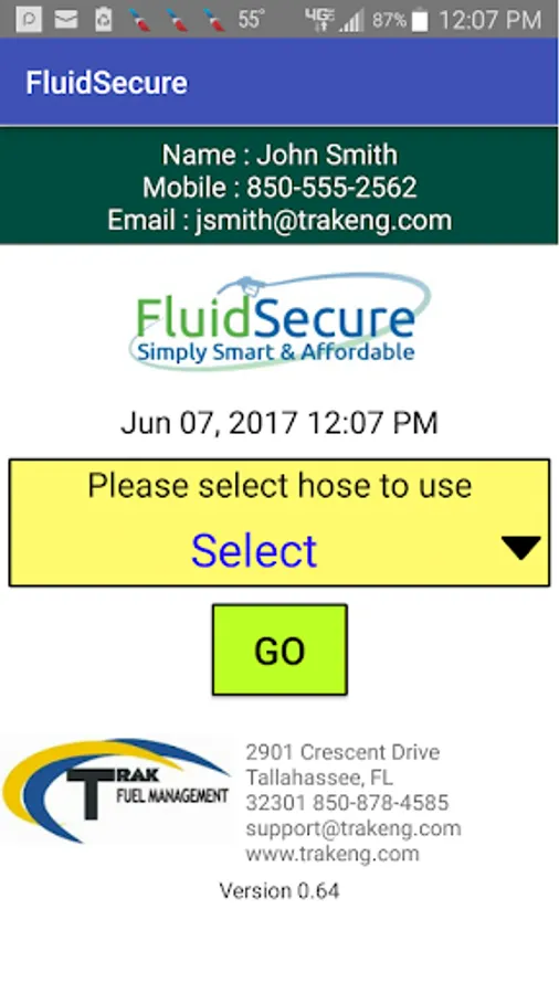 Users just open the app next to a fluid controlled site, enter in all requested data and select the appropriate hose. All input data is authenticated via the FluidSecure cloud. The system unlocks the controls and allows pumping. Finished transactions are stored in the cloud for easy access and reporting. All data is controlled via a secure web page where you enter all users, vehicles and fuel sites. Complete reporting is available via the web site and can be accessed via any cell phone, tablet or PC.