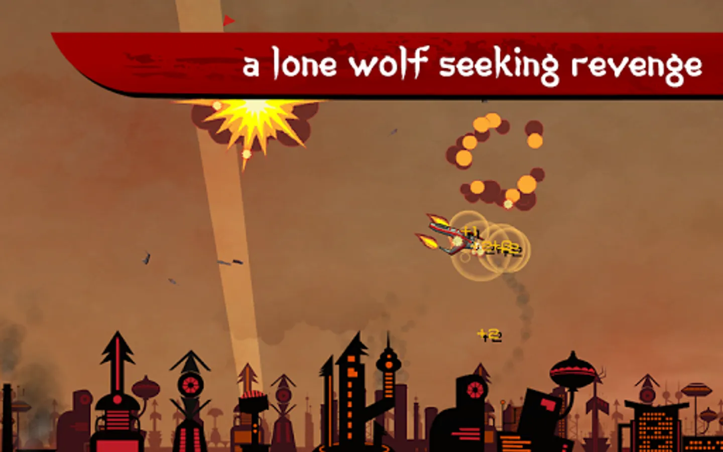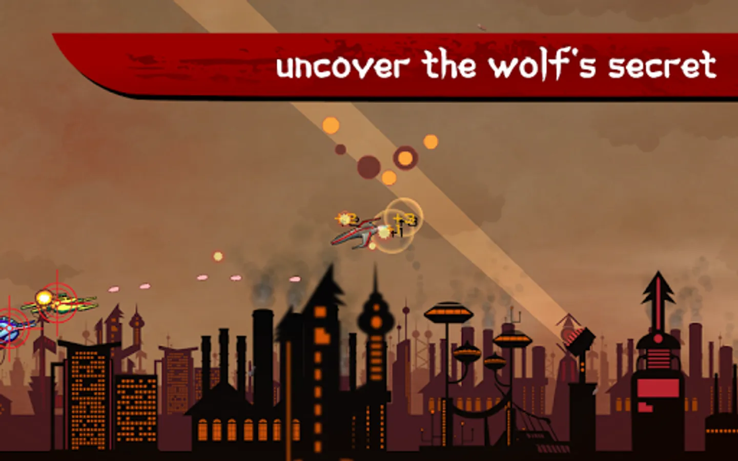Take on countless waves of enemies as the legendary fighter pilot Kateru in this fast-paced old-school arcade shooter. A strange city and the ever-dark skies above bear witness to your unmatched dog fighting skills. As you upgrade your fighter, more and tougher enemies will be sent your way to test your mettle. Do you have the skill and determination to make it to the end and ultimately uncover the mysterious identity of the lone wolf?