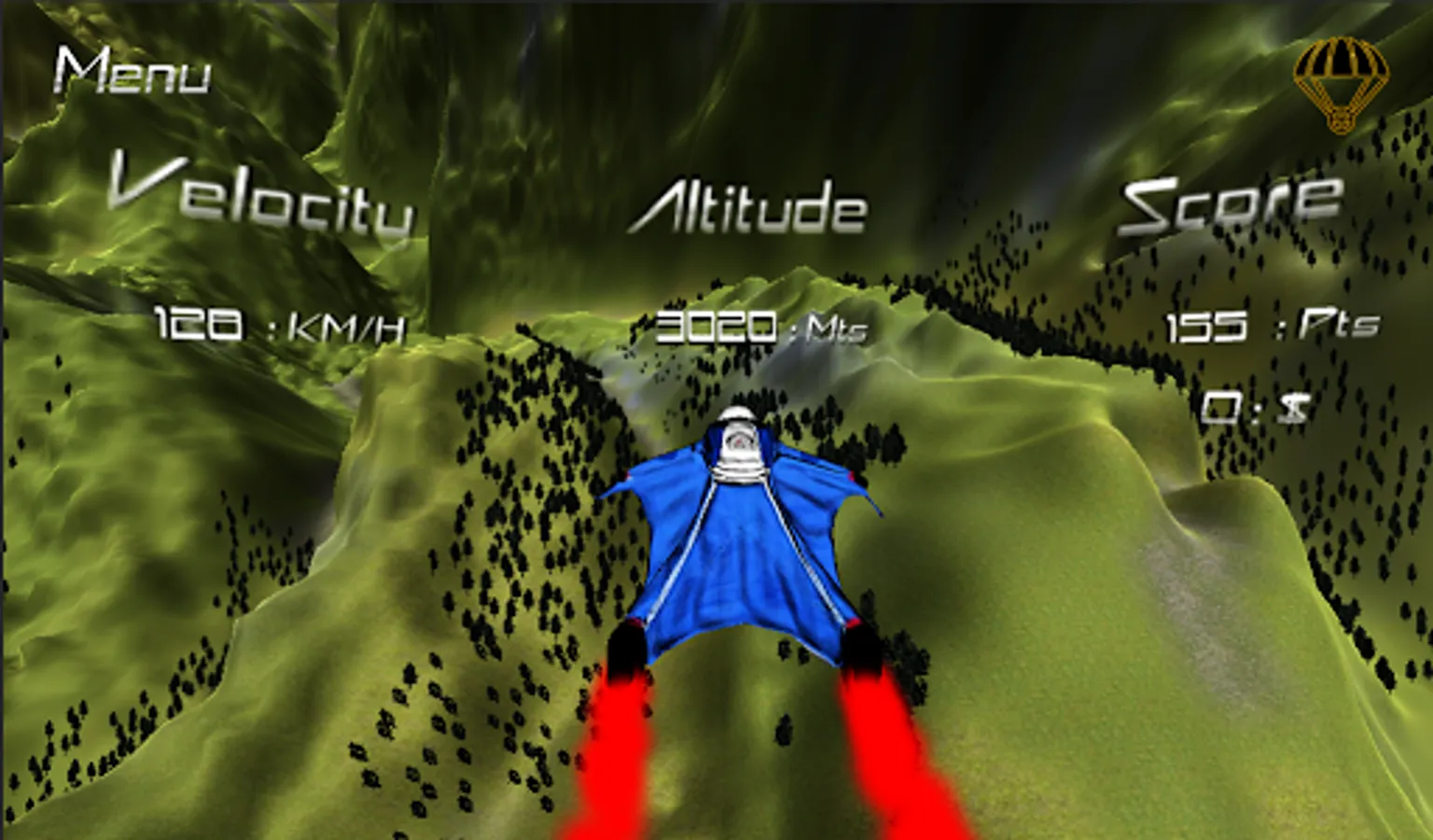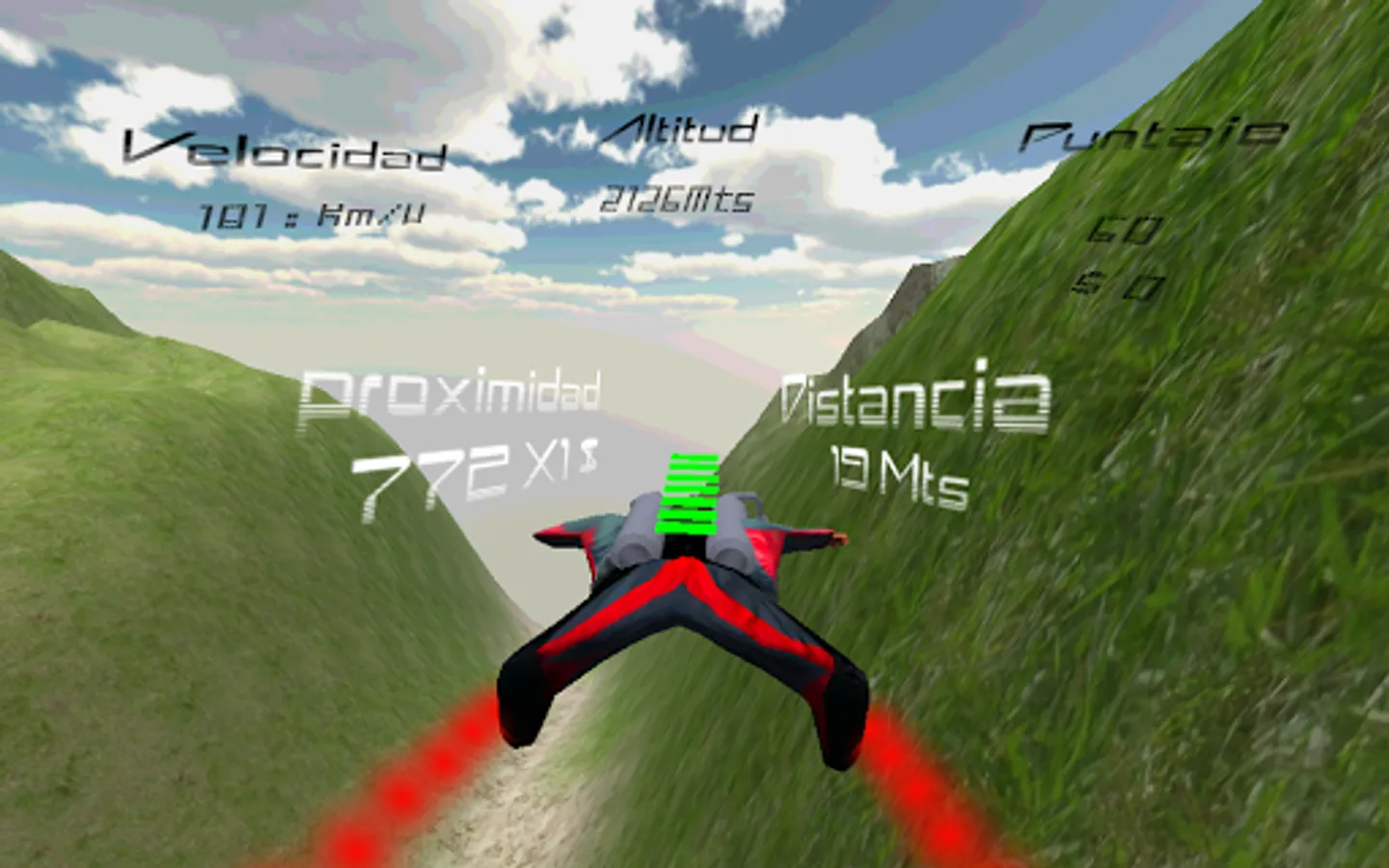 Fly like a professional of wingsuit through the mountains doing proximity flying, doing pirouettes and win points.