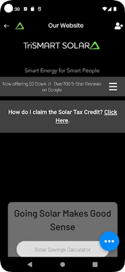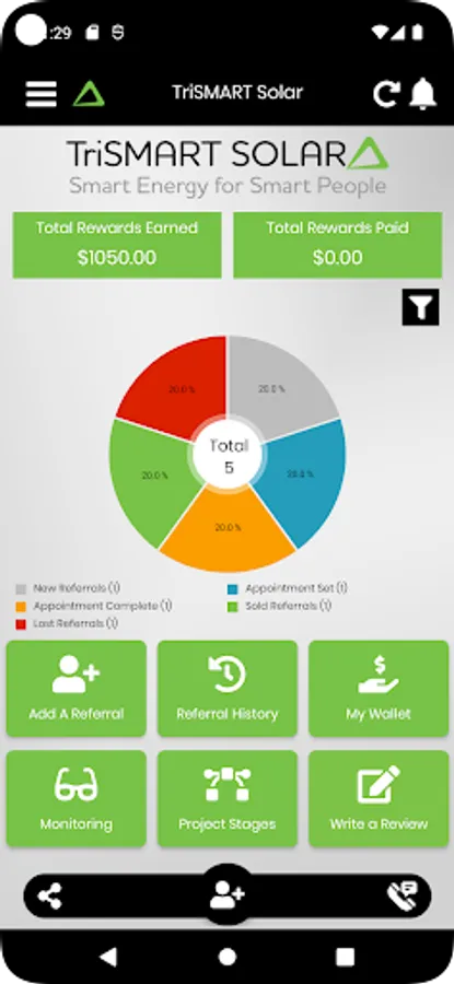 TriSMART Solar is a free app available for anyone to download and is used for those that want to earn rewards by sending referrals to TriSMART Solar. It is as simple as downloading the App, selecting the sales rep and registering. Once registered, you can begin sending referrals right away. It is the one app that will allow the user to easily submit referrals to TriSMART Solar and track the progress of your referral and rewards right on your mobile device. Referring has never been so easy.