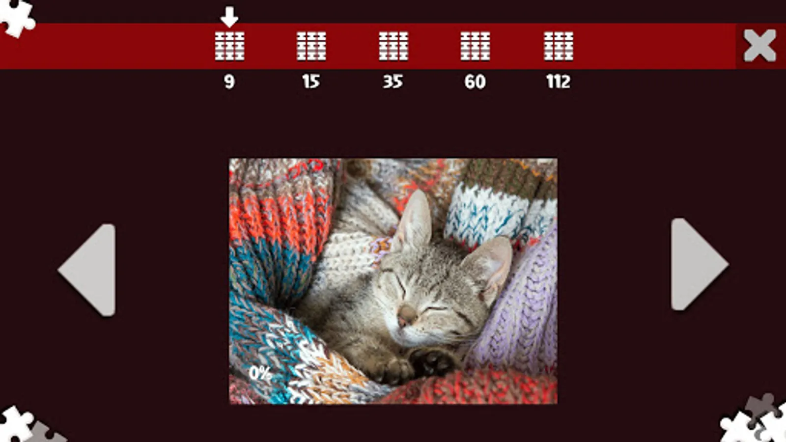 Our puzzle game will please everyone from beginners to more experienced, the complexity of the game depends on the number of puzzle pieces that need to be fitted, with 5 different levels (9, 15, 35, 60, 112). Choose your favorite puzzle.
