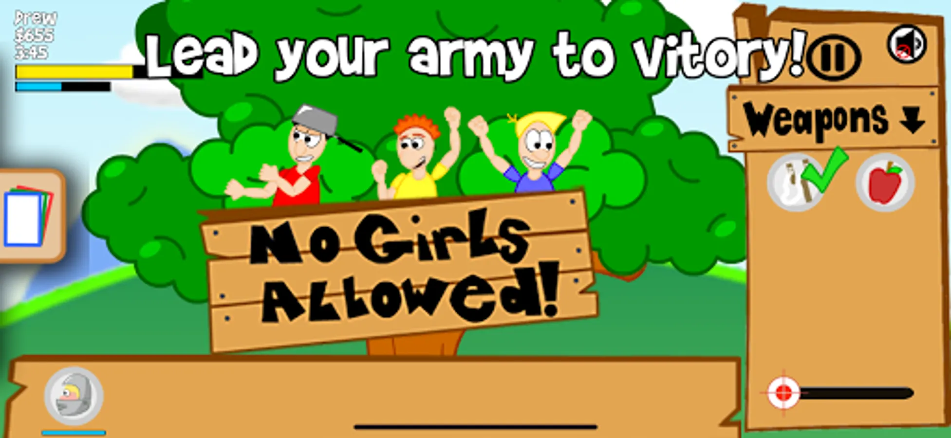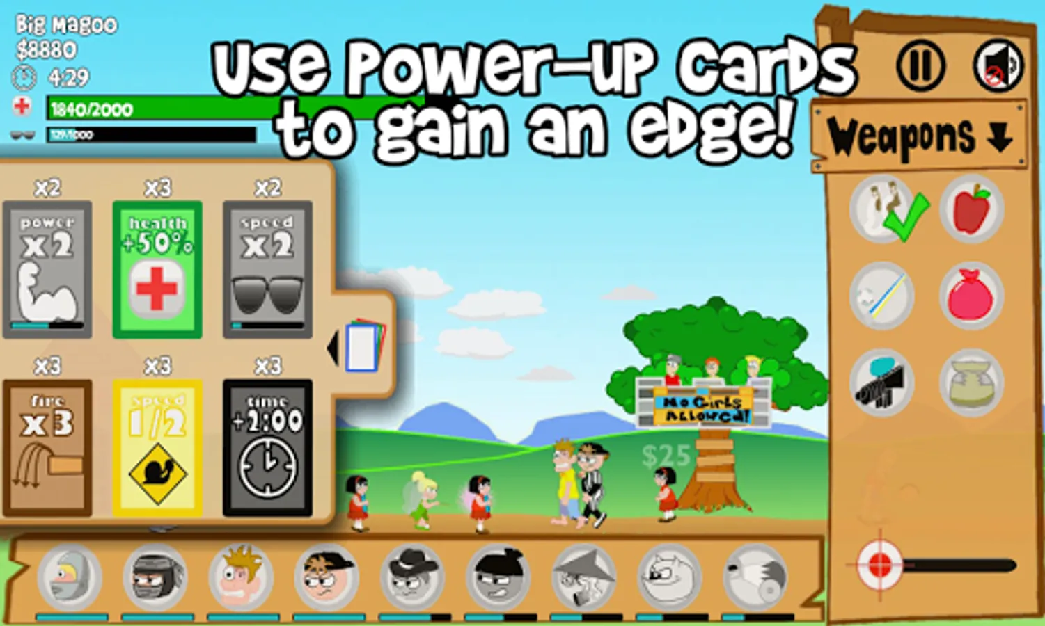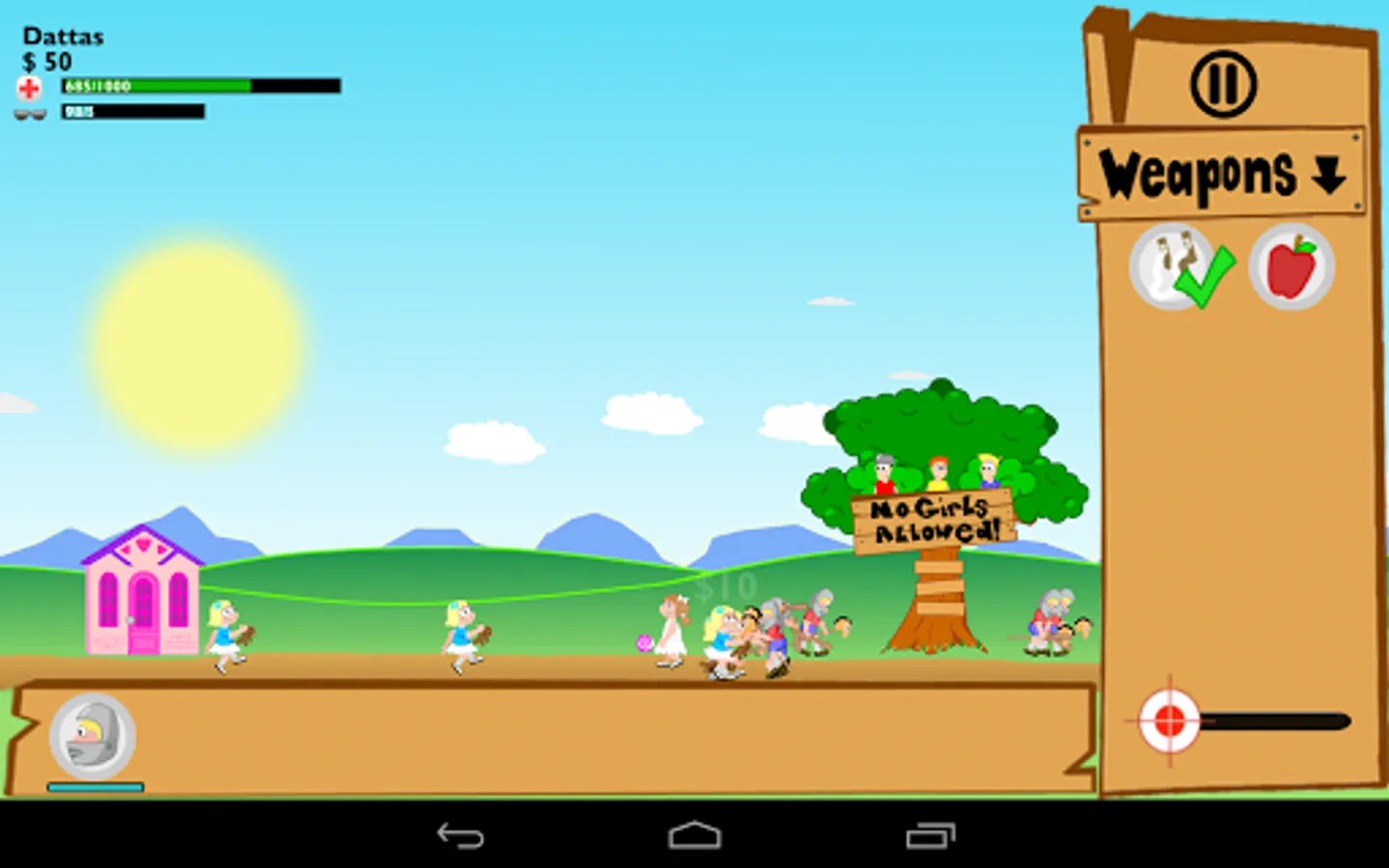 Defend your fort from the ruthless onslaught of the little girl army. Use slingshots, water balloons, dirty diapers, and more to gain an edge in the war. But it doesn't stop there - you will also be able to unlock 9 different recruits to aid you as you clash with the girl clan, from baseball players to cowboys to knights. This fast-paced defense game will keep you on your toes and entertained for hours.