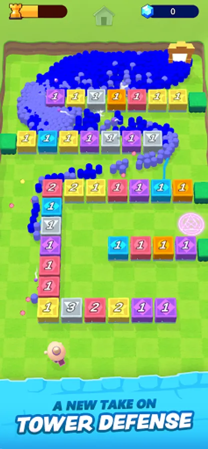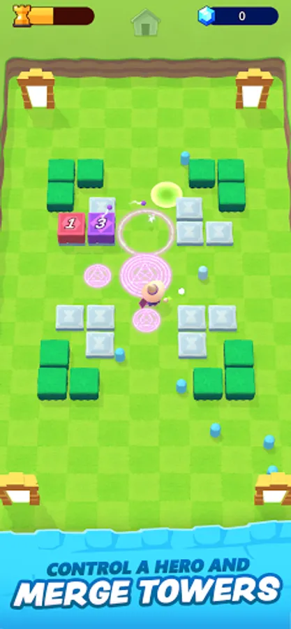 Hundreds of evil tiny enemies try to get to the secret portal and destroy your world. Strategically place your towers and merge them to prevent that from happening. Control your wizard to help out with shooting the enemies where it's most needed. Pick up towers of the same color and level to merge them into a random higher tower to increase your firepower and win the level.