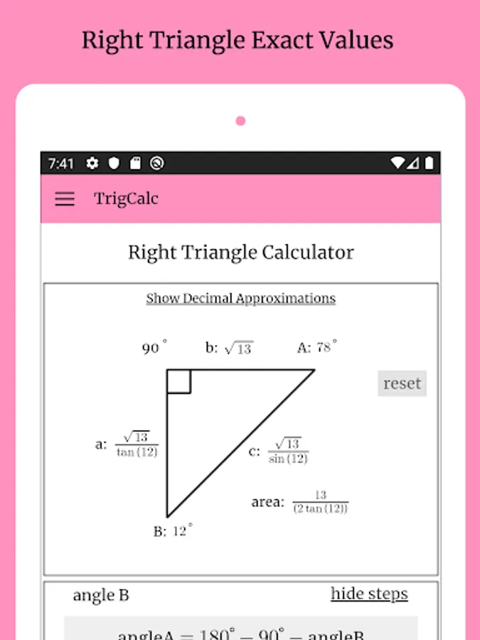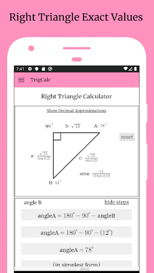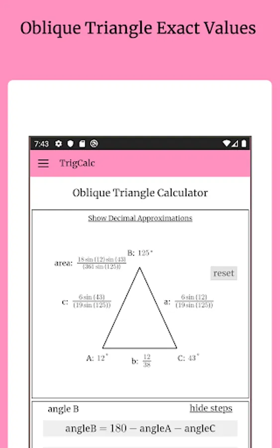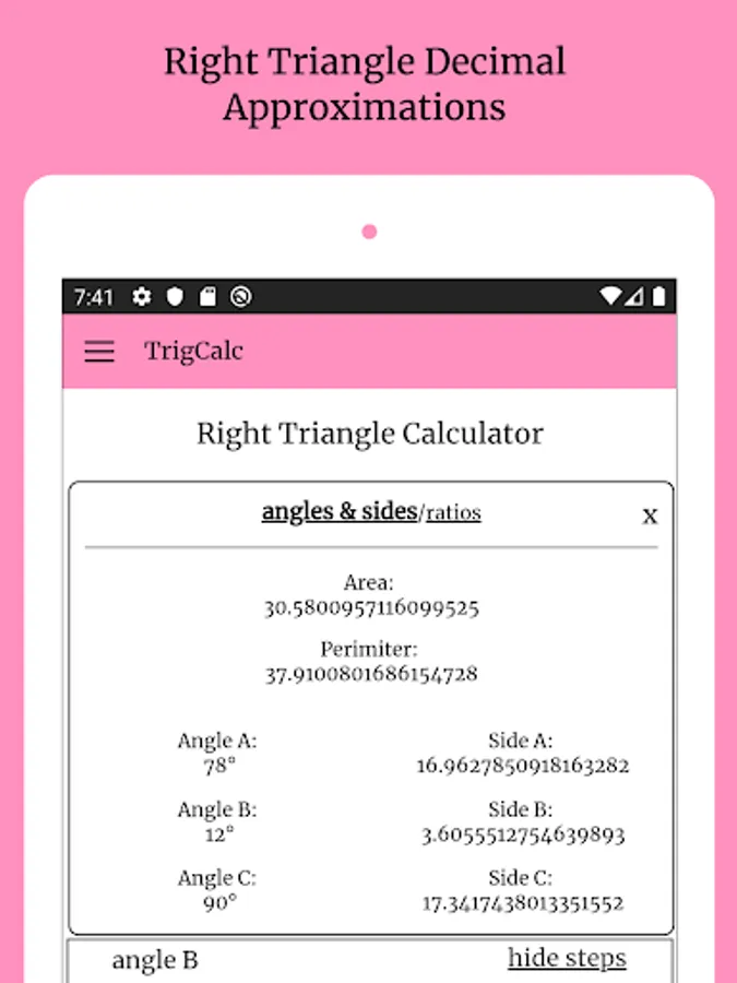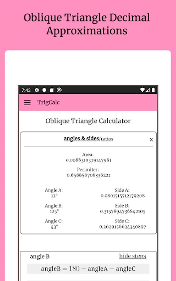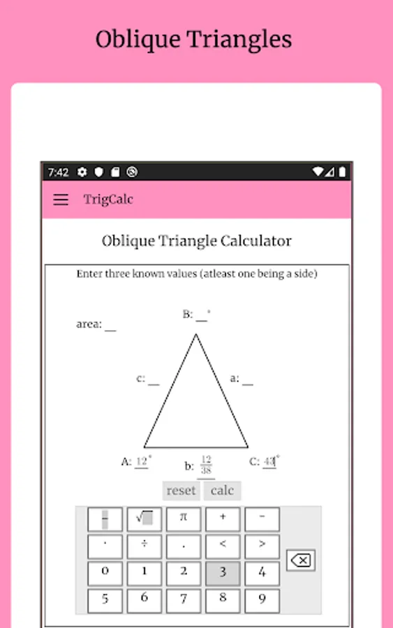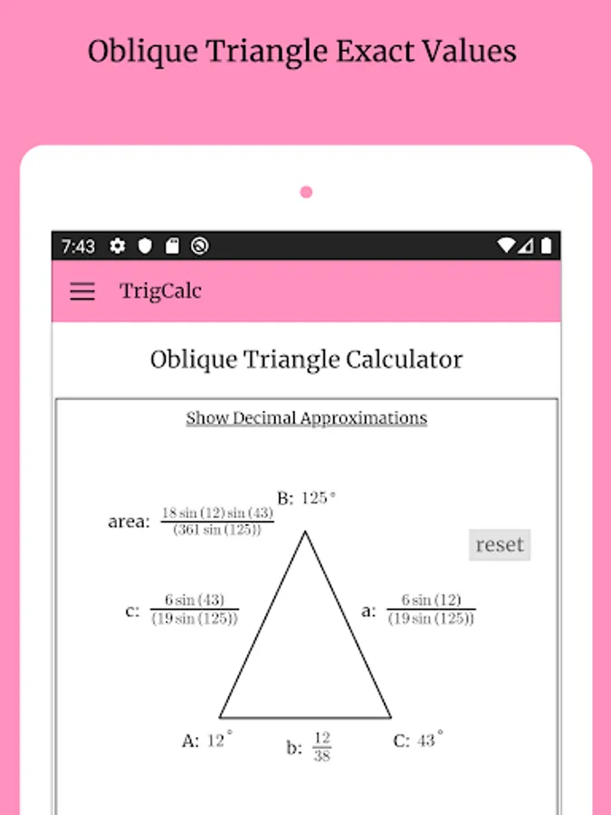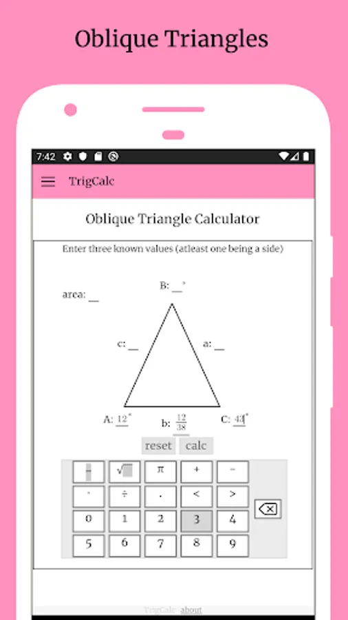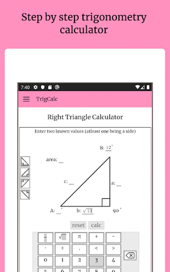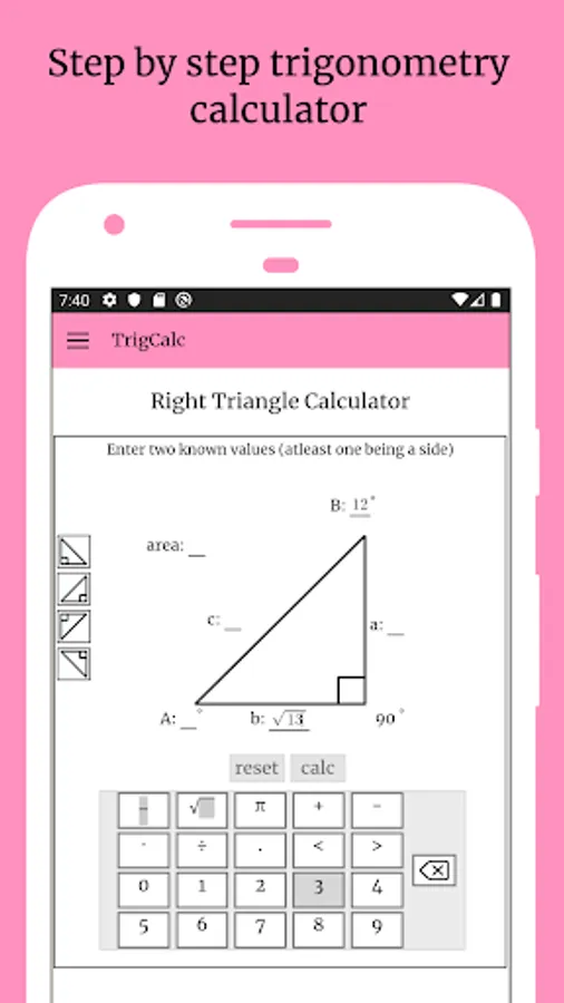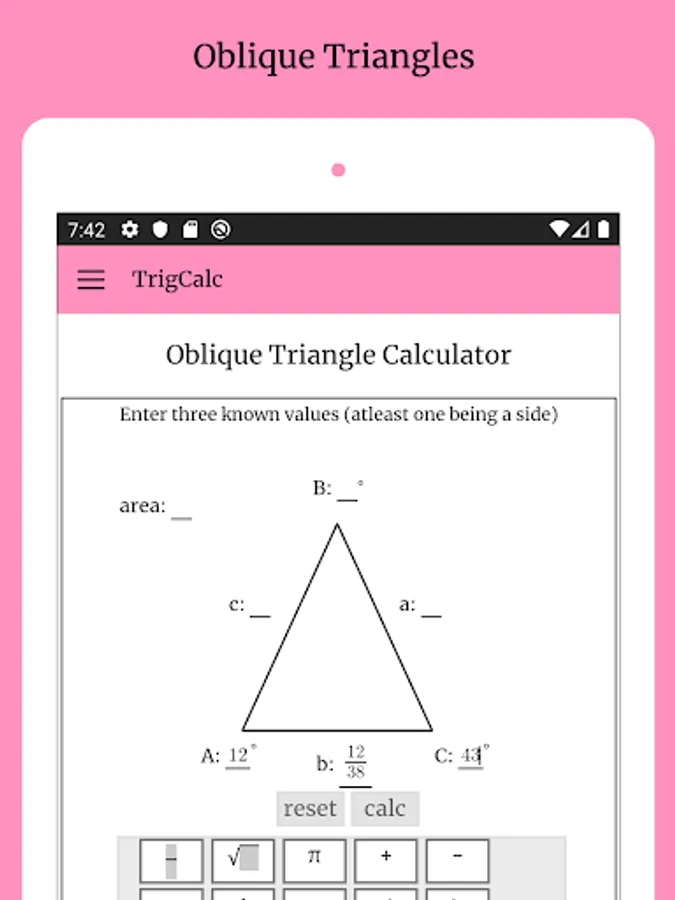 Trigcalc trigonometry calculator helps to teach & solve math, Triangle calculator is also created to solve and teach trigonometry in the simplest way possible. It is also the most popular one. All calculators are returns step by step explanations for all of its calculators. There is a right triangle, It is represented with a rotatable right triangle with math fields located in their corresponding locations. All math fields support the use of exponents, radicals, pi, multiplication, division, and decimals. To make a right triangle calculation, enter two values with one being a side and tap the calc button. After about two seconds worth of load time, Trigcalc displays the exact values of all missing sides and angles in the math fields with the steps for each value below. The oblique triangle works in a similar way. It uses a different set of formulas for calculations and may display two solutions. It also does not rotate. Another popular is its coterminal angle. The coterminal angle is displayed with a drop down option list requesting either the least positive or least negative angle coterminal with a certain angle in either degree or radian form. After selecting from the option list and tapping the calc button, returns the exact value, decimal approximation, and calculation process for the coterminal angle. Identity calculators include double angle, half angle, power reduction, sum difference, sum to product, and product to sum. Identity calculations require a chosen identity, a given function, a given ratio, and a given quadrant. The solution consists of the exact value of tan2u and steps including how sinu in quadrant one can be used to find tan2u. While it is not as popular Sector is very useful. Sector calculations contain a sector image and math fields just like triangle calculations. Sectors require two values as at least one being radius or angle and provide all values. It also allows you to swap to its circle that only requires one value. The function calculator allows you to get the value of all trig functions given any value. Each function returns a solution to sixteen decimal precision. Supplementary angles are angles whose sum equals one hundred and eighty degrees. Supplementary takes in one angle in either degree or radian form and sends back the corresponding supplementary angle with is one hundred and eighty minus the given value. Complementary angles are angles whose sum adds up to ninety degrees. complementary works very similarly to its supplementary by returning ninety minus the given value with steps and exact values. For every exact value in Trigcalc, a decimal approximation is also available. All of the decimal approximations have sixteen digit precision ex 5.9718346348117407. The trigonometry calculator is aimed for simplicity and accuracy.