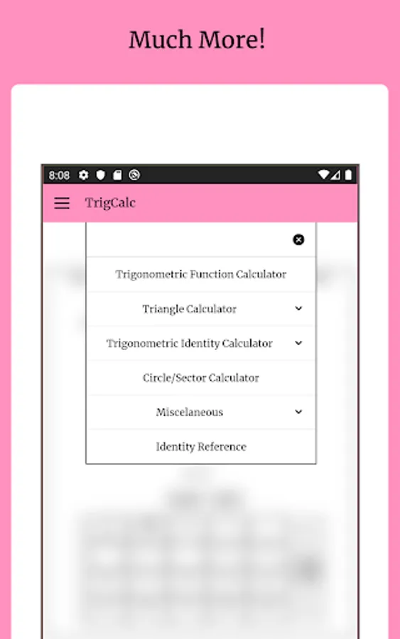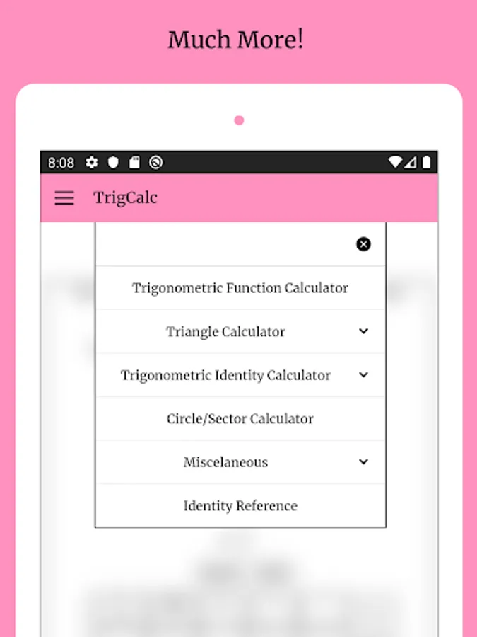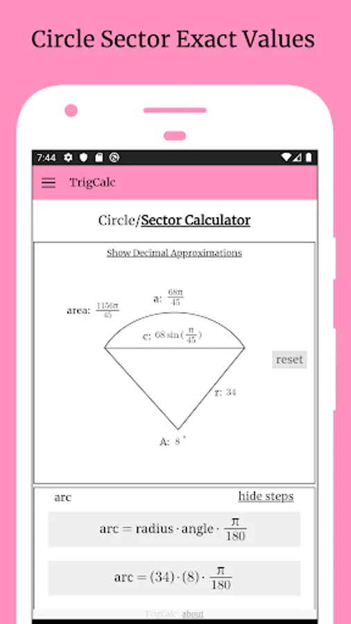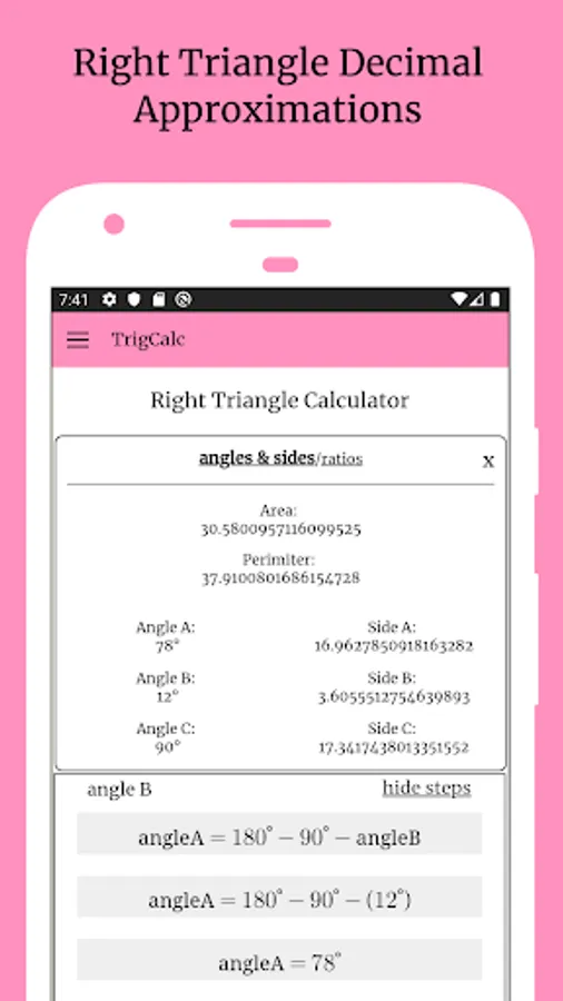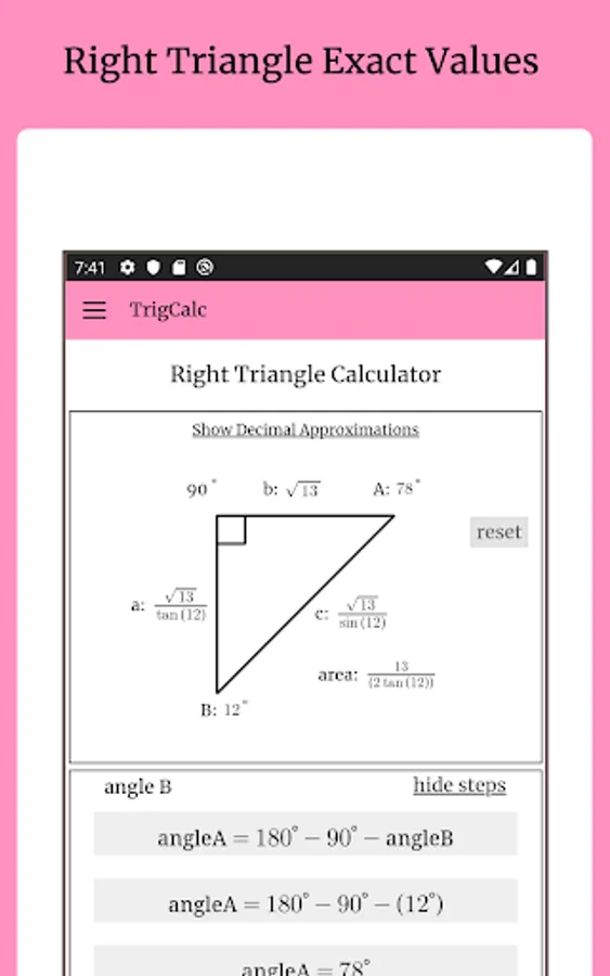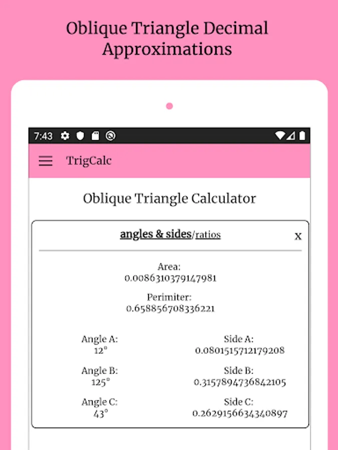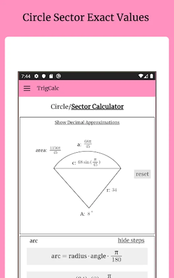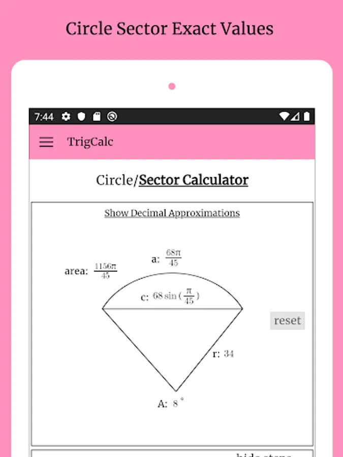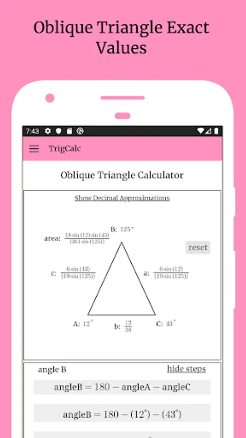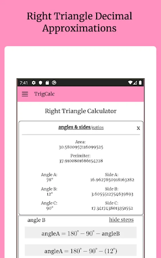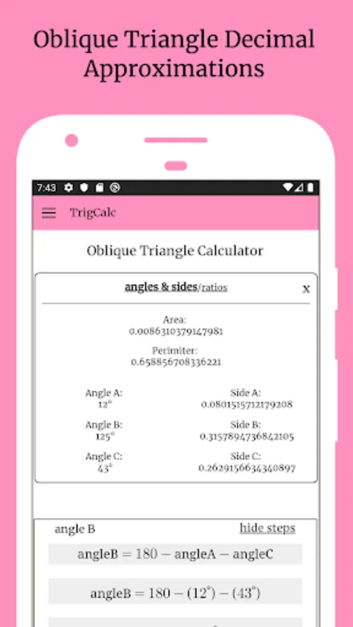Trigcalc trigonometry calculator helps to teach & solve math, Triangle calculator is also created to solve and teach trigonometry in the simplest way possible. It is also the most popular one. All calculators are returns step by step explanations for all of its calculators. There is a right triangle, It is represented with a rotatable right triangle with math fields located in their corresponding locations. All math fields support the use of exponents, radicals, pi, multiplication, division, and decimals. To make a right triangle calculation, enter two values with one being a side and tap the calc button. After about two seconds worth of load time, Trigcalc displays the exact values of all missing sides and angles in the math fields with the steps for each value below. The oblique triangle works in a similar way. It uses a different set of formulas for calculations and may display two solutions. It also does not rotate. Another popular is its coterminal angle. The coterminal angle is displayed with a drop down option list requesting either the least positive or least negative angle coterminal with a certain angle in either degree or radian form. After selecting from the option list and tapping the calc button, returns the exact value, decimal approximation, and calculation process for the coterminal angle. Identity calculators include double angle, half angle, power reduction, sum difference, sum to product, and product to sum. Identity calculations require a chosen identity, a given function, a given ratio, and a given quadrant. The solution consists of the exact value of tan2u and steps including how sinu in quadrant one can be used to find tan2u. While it is not as popular Sector is very useful. Sector calculations contain a sector image and math fields just like triangle calculations. Sectors require two values as at least one being radius or angle and provide all values. It also allows you to swap to its circle that only requires one value. The function calculator allows you to get the value of all trig functions given any value. Each function returns a solution to sixteen decimal precision. Supplementary angles are angles whose sum equals one hundred and eighty degrees. Supplementary takes in one angle in either degree or radian form and sends back the corresponding supplementary angle with is one hundred and eighty minus the given value. Complementary angles are angles whose sum adds up to ninety degrees. complementary works very similarly to its supplementary by returning ninety minus the given value with steps and exact values. For every exact value in Trigcalc, a decimal approximation is also available. All of the decimal approximations have sixteen digit precision ex 5.9718346348117407. The trigonometry calculator is aimed for simplicity and accuracy.