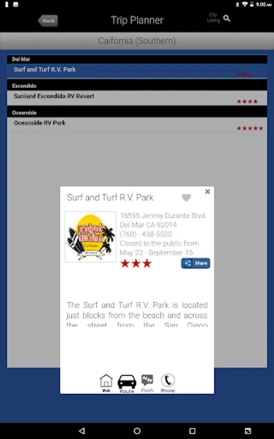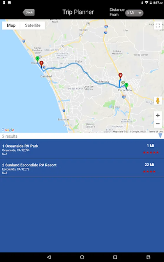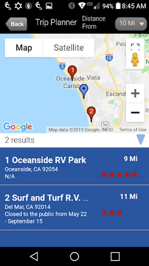 Provides a list of participating RV Parks within a specified distance (5 mi, 10 mi) of your current location. The results are provided either alphabetically or by distance.