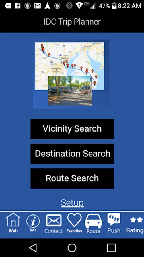 The IDC Trip Planner offers a market-leading, comprehensive set of technologies and value-added tools for property networks, truly REVOLUTIONIZING guests’ ENGAGEMENT EXPERIENCE in the mobile space. Fully customizable for individual property networks, our TripPlanner Services App is offered as a stand-alone App. It should be noted that, as shown, the IDC Trip Planner is configured as an RV Park Property Network, with properties distributed across the United States.