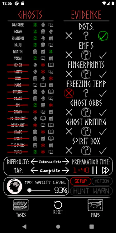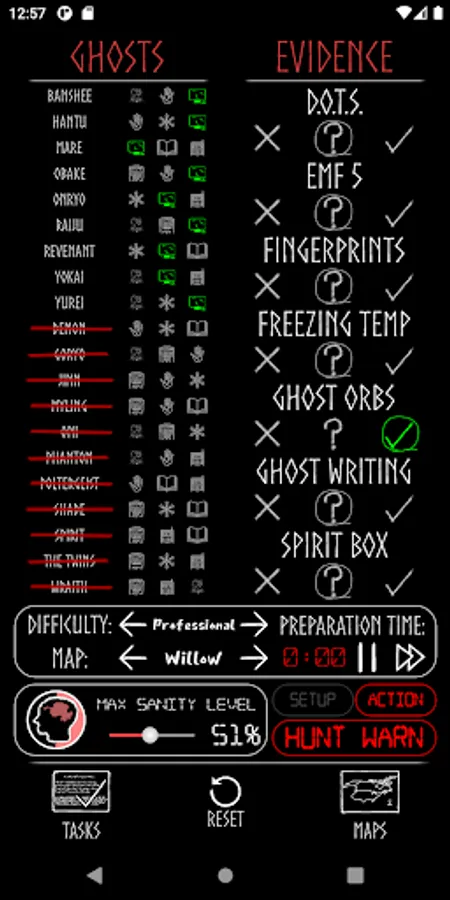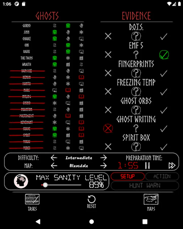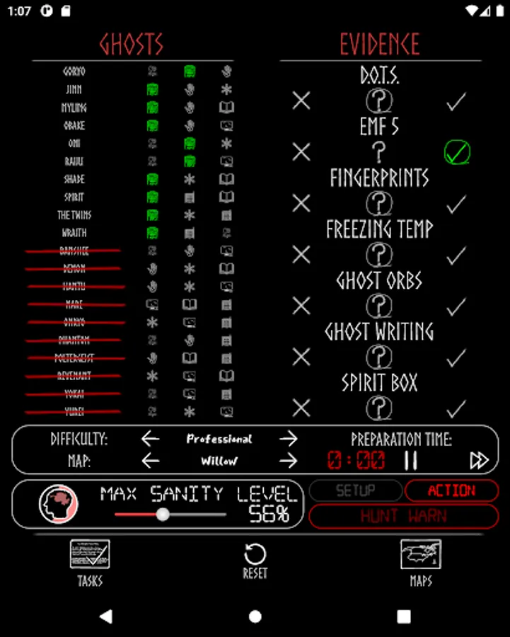 Choose the difficulty mode, then choose your Evidence to narrow down the remaining ghost types for you! You may also wipe ghost names to eliminate specific ghosts. The Evidence required for each ghost is clearly defined to help you determine which type of evidence remains.