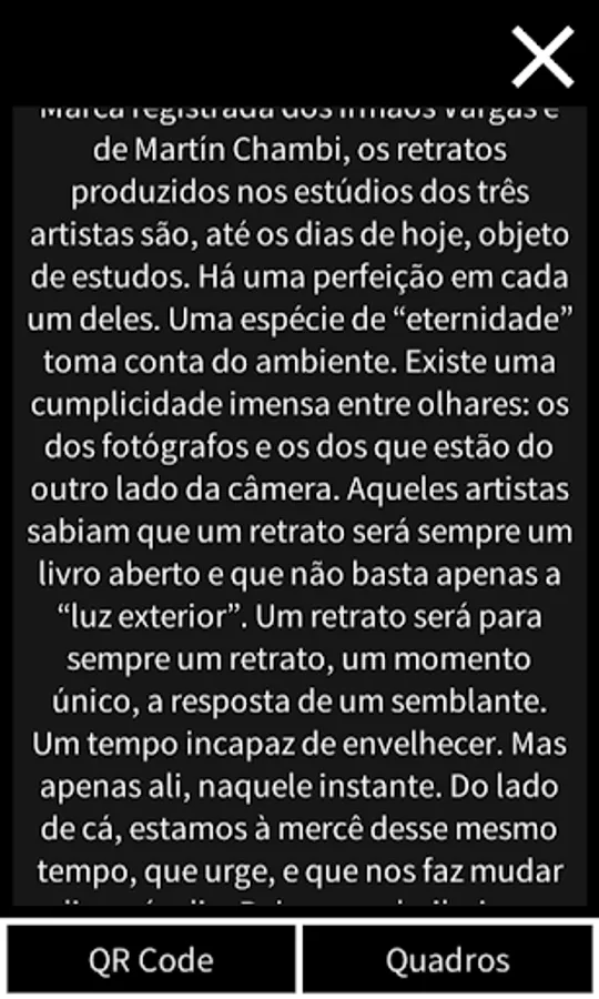 This application brings complementary information - photos, texts and locutions - to those who visit the exhibition "Irmãos Vargas Art Studio meets Martín Chambi" at the Museum of Photography of Fortaleza, through the use of QR Code.