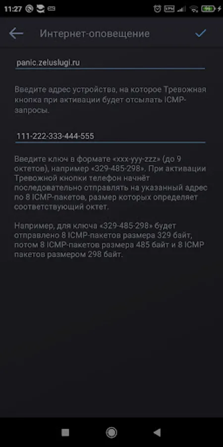 When the button (press and hold) is activated, an Internet request is sent to the DNS or IP address you specified, consisting of a sequence of IMCP packets of the size specified in the Key, and three SMS messages with the Key are sent to the specified number. Additionally, you can enter up to three phone numbers of your colleagues and acquaintances, who will also be sent the SMS message you specified about the activation of the Panic button. In the settings menu, you can choose which of these functions will work when the Panic button is pressed.
