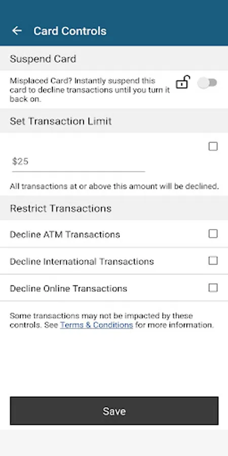 • Turn your debit or credit card on/off. Easily lock and unlock your cards if they are lost or stolen.