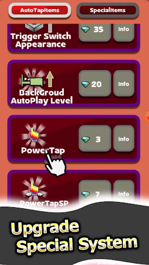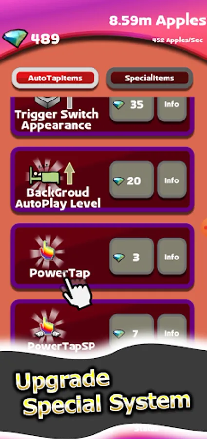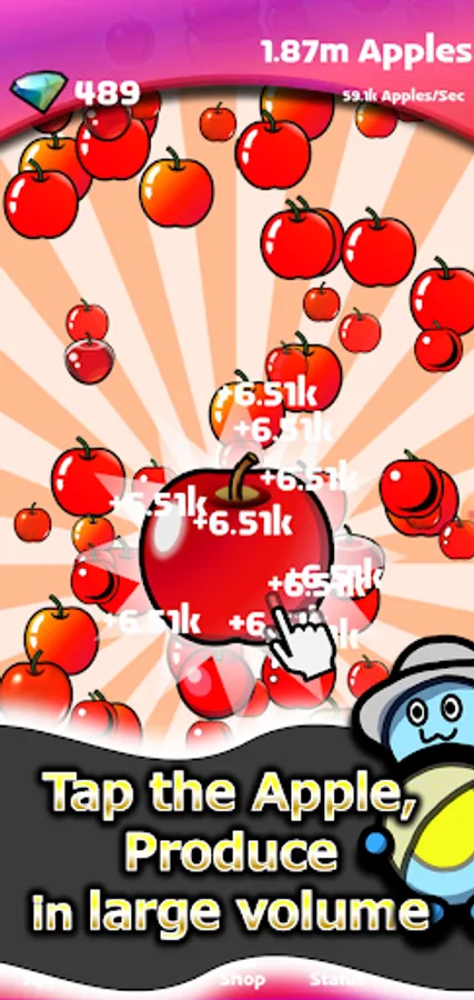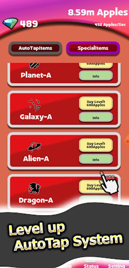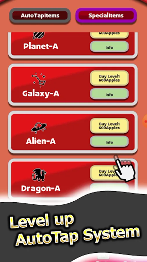 ・Tap automation items, tap power increase items, and special effect items to increase the efficiency of apple collection.
