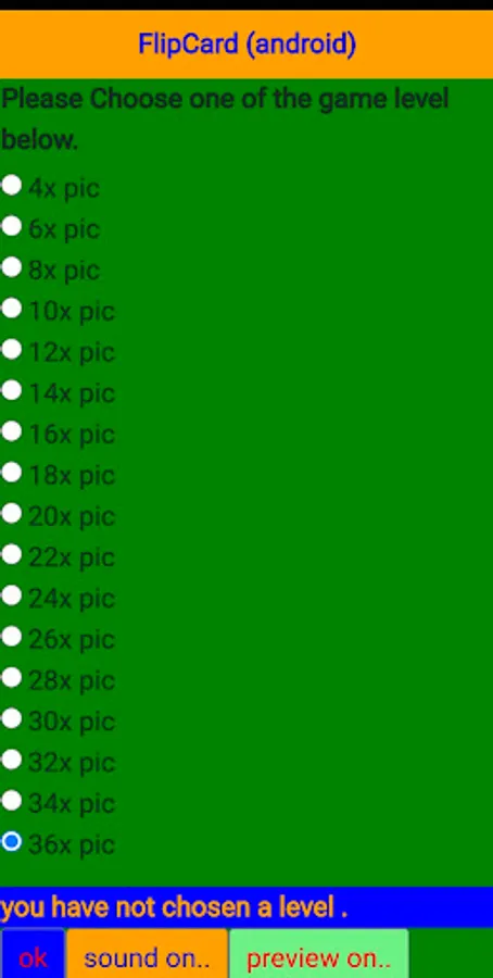 This is a classic memory card application port from my palm application. it consist of 4x 6x 8x 10x 12x 14x 16x 18x 20x 22x 24x 26x 28x 30x 32x 34x 36x game.moreover,it will automatically increase the game level .ie continuous play.
