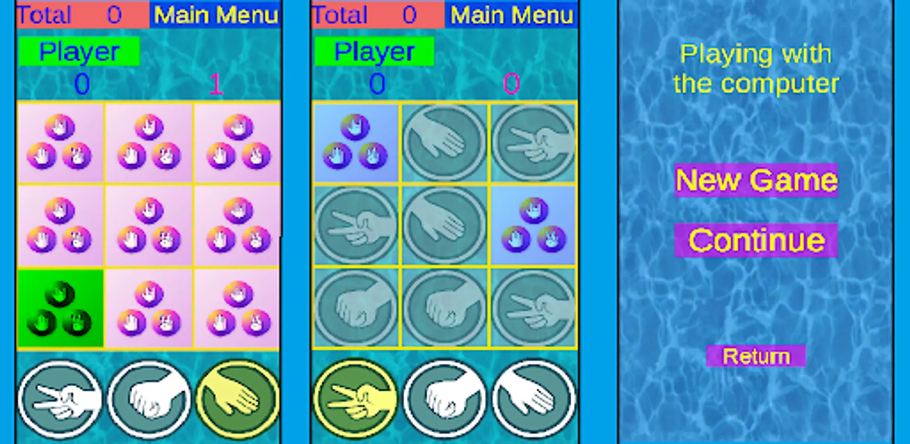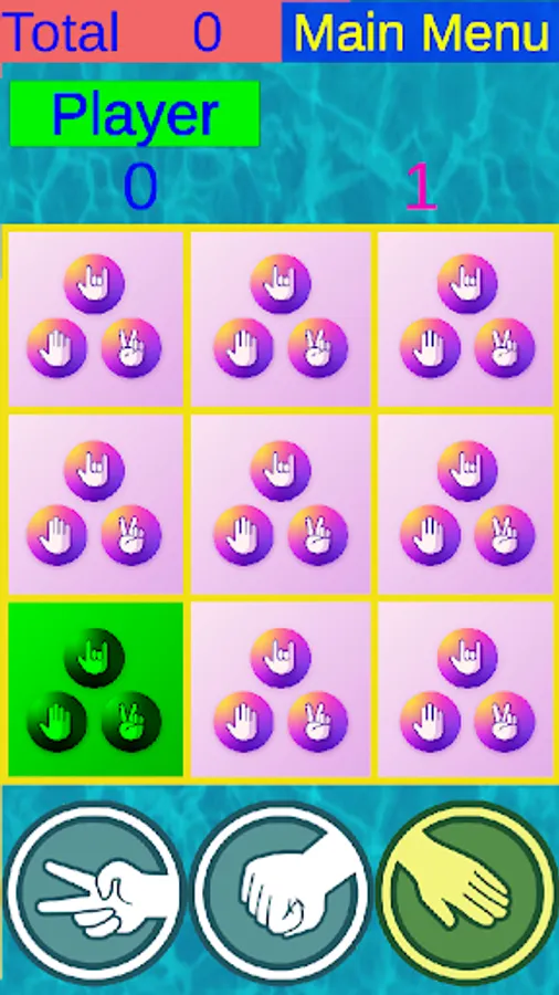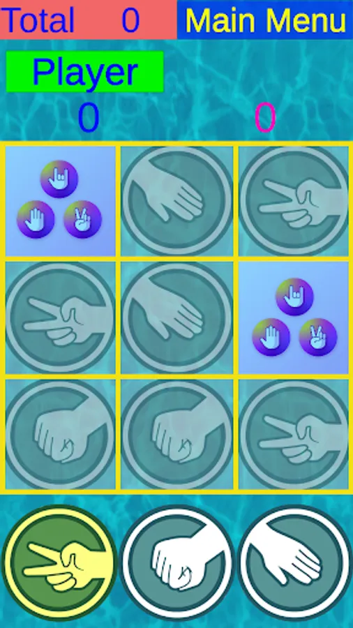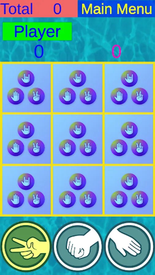 In a game with a computer, the player hides a rock, scissors and a paper in 9 cells in total. Then, in turn, the computer also hides the rock, scissors and paper. After that, the player begins to find what the computer has hidden. to do this, he takes a rock, scissors or paper from the lower panel and puts it on the squares of the upper field. if his choice wins what is hidden there, then this field opens and can make the next move,. if they are the same, then the equality sign appears. If didn't win, this field does not open and the move goes to the computer. The best score score is saved on the topmost "Total" field.