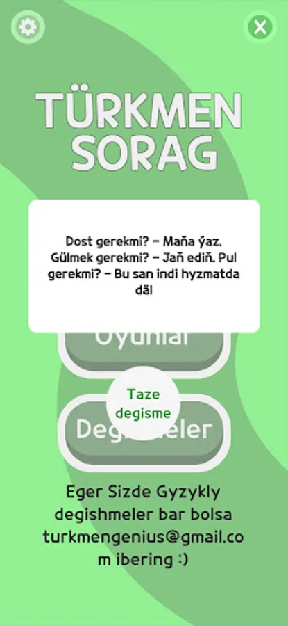 Türkmen Sorag bu taze android programma soraglar we turkmen mini oýunlar bilen hem üpjün edýar.Soraglar-da taryh,informatika,iňlis-dili we s.m soraglar hem bar! Täze turkmen oýunlardan we soraglardan lezzet alyň!Turkmen Soragda durli 5 sany mini oflaýn oýunlar bar! Dürli gyzykly soraglar we türkmen oýunlary sizi garaşýar!