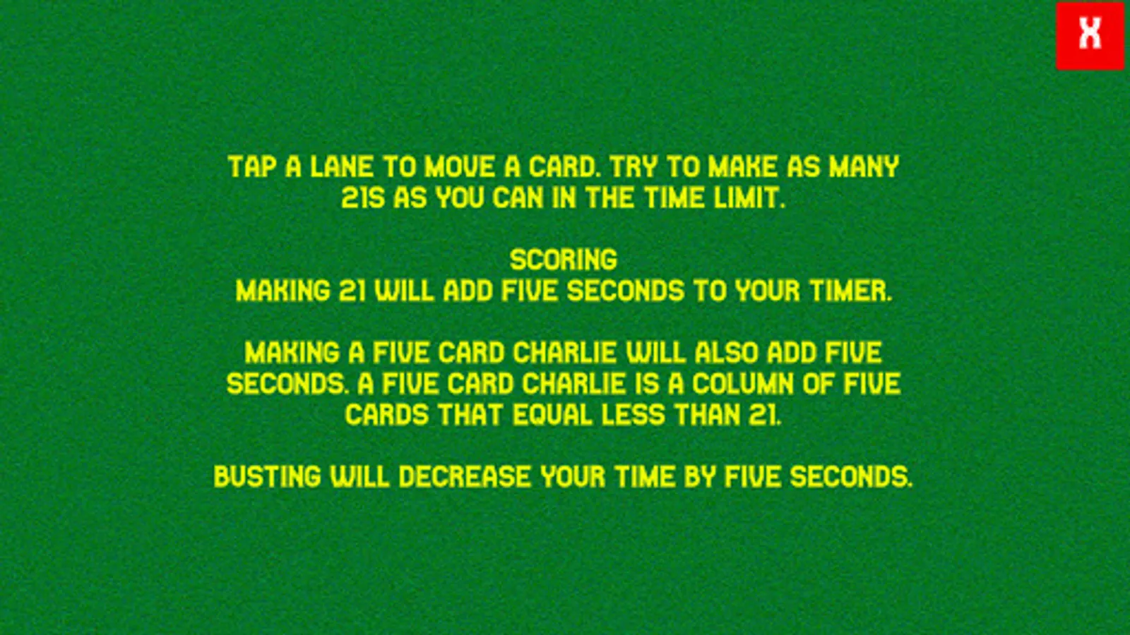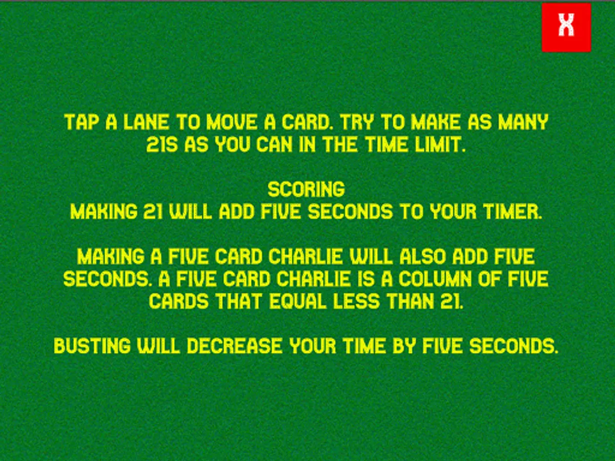 21 Turbo Blitz is a game of chance and strategy. Make 21 in any column to increase your timer by 5 seconds. Beware, if you bust, you will lose five seconds! Keep going as long as you can and see if you can't beat your own best time!