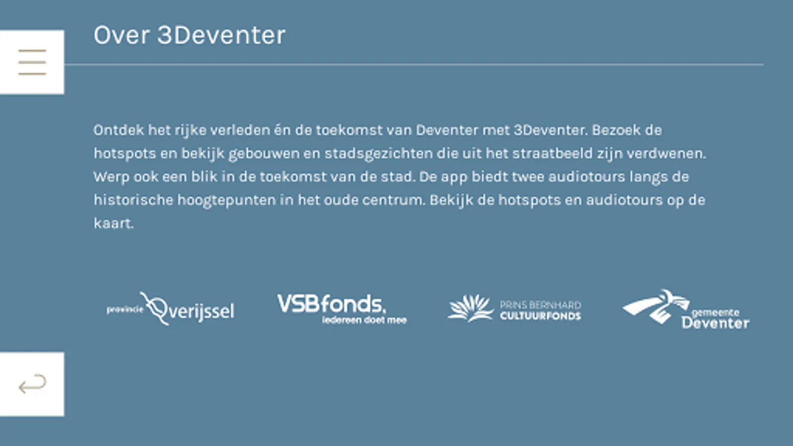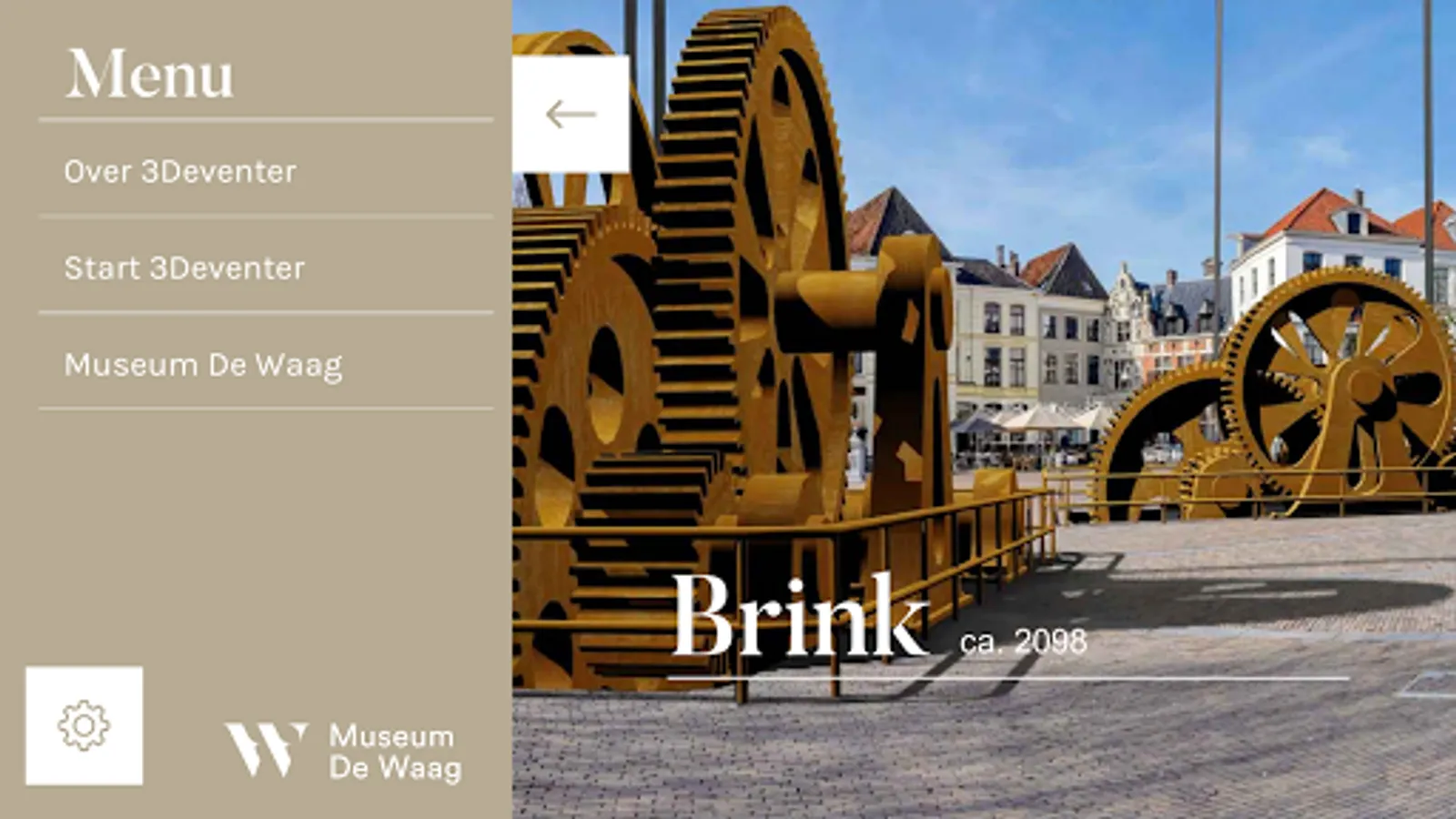 Deventer is known for its rich history. Museum De Waag wants to make visible and tangible the unique history with changing exhibitions. But the journey through time does not stop within the walls of the Museum De Waag. The app will take museum visitors and other interested parties time to show what "time" does a city. Through innovative 3D reconstructions are buildings that have disappeared from the streets, to see if they are still there now. Future perspectives of artists show how the city can develop in the coming centuries. In this way, the heritage of the city experienced in a unique way.