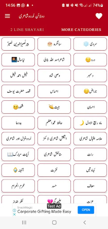 Good Morning, Night, Zindgi, Ghum, Tanhai, Zid, Dhoka, Badnam, Wqt, Islami ,Mosam, Yad, Birthday, Wada, Dosti, Zakham, Humsafar, Judai, Ishq, Nafrat, Chaiy, Eid, Dua, Mout, Zamana, Dill etc
