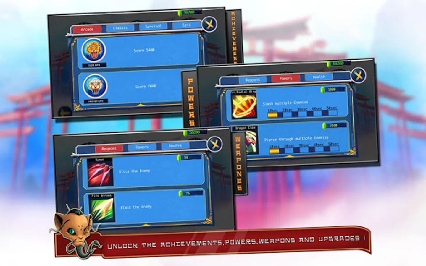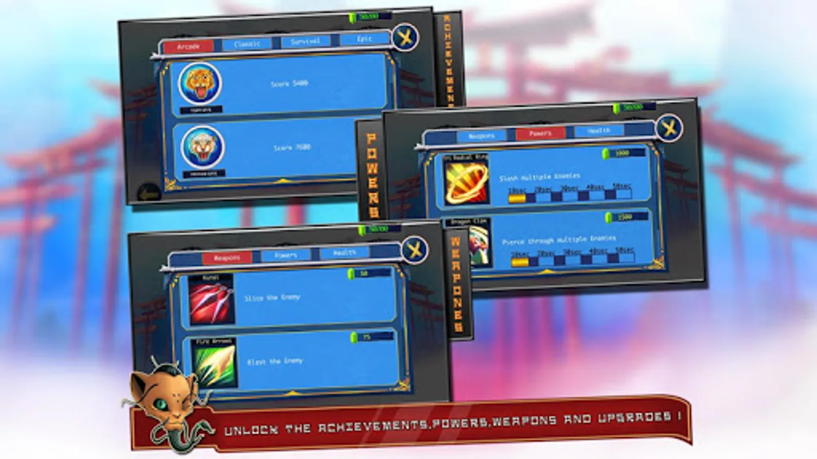 Cat Monk just doesn't fight with his bare hands, he is well versed with different weapons and he possesses some superpowers. Upgrade the powers and Equip the weapons in Upgrades Menu by using the gems bought with real currency or earned in the game.