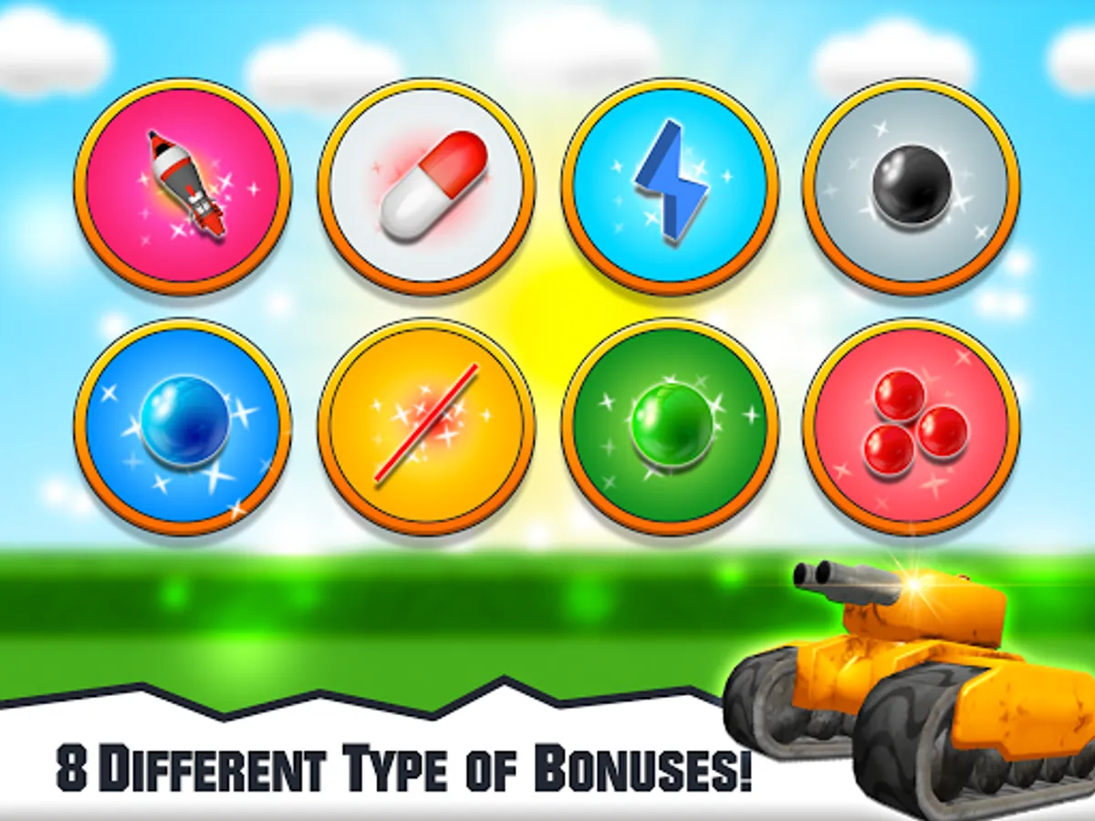 • Unique and effective bonus features… (Guided missile, laser, canister shot, drunk cannon (disorients enemy tanks) and freezing cannon)