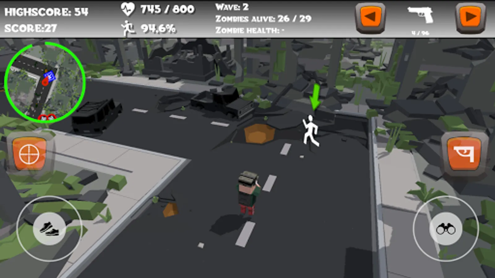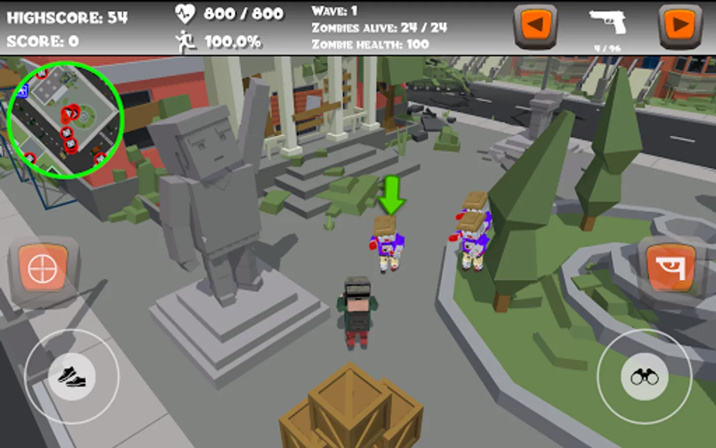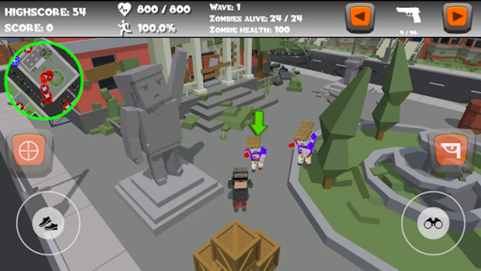 Zombies will spawn on several locations on the map, and they will search for you. Try to defeat them before they defeat you! There are three different kinds of zombies: