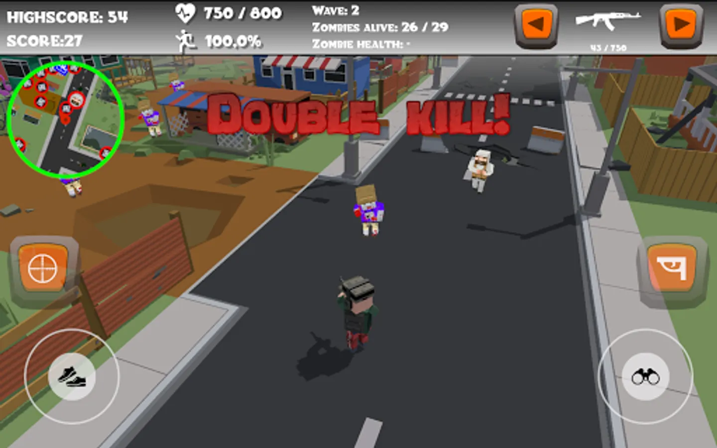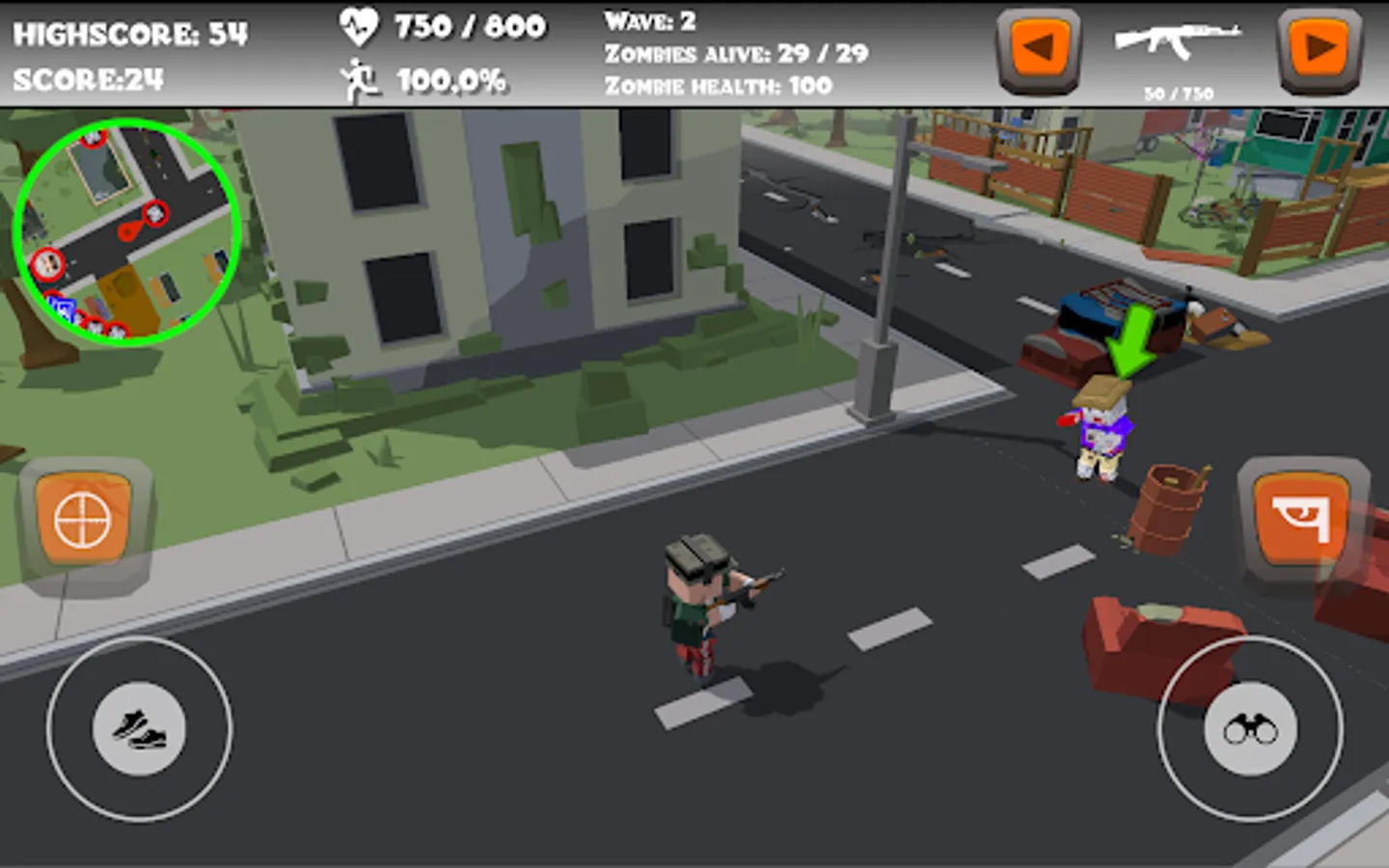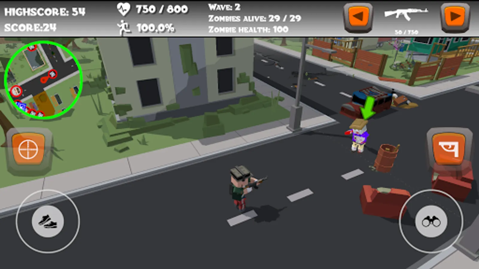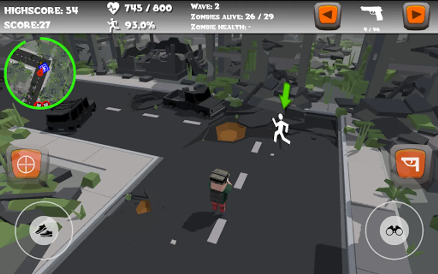 The minimap will come in handy to find refills and zombies. After each next wave, you'll find directly where to go. There are three different kinds of zombies, 3 different kinds of refills and the character that you play with, that can be shown on the minimap.