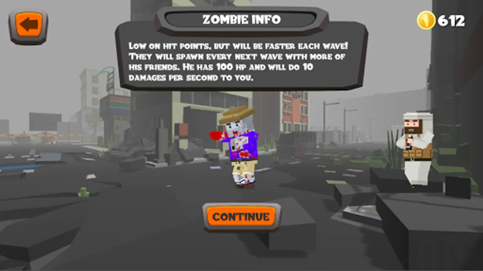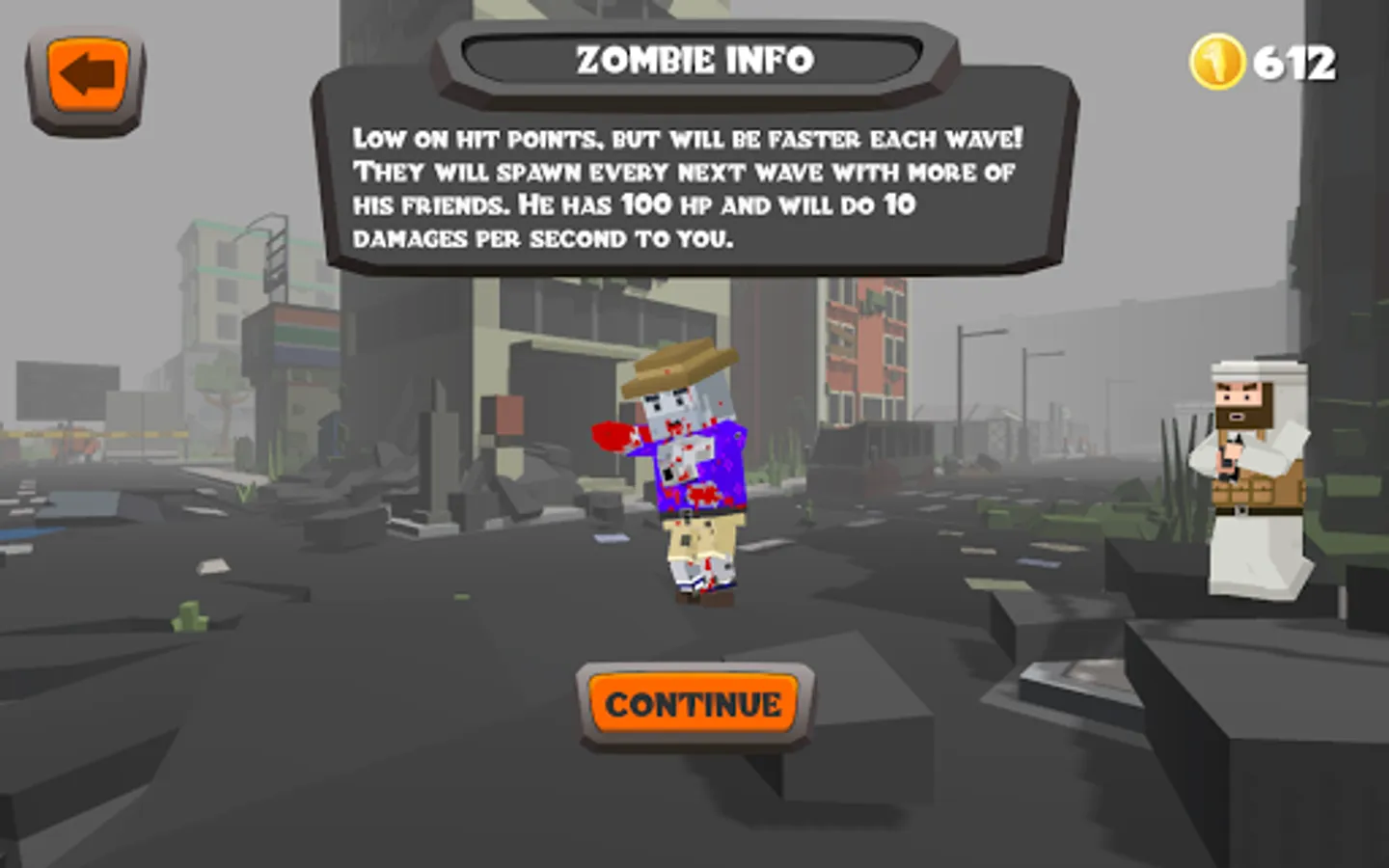- Normal zombie : 100 hit points and will be faster each wave. Does 10 damage per second