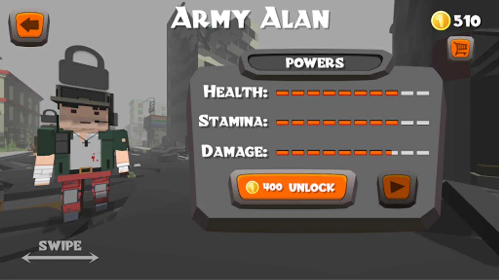 This survival game has 14 different characters to play with. Buy 13 characters with the coins you earn. A more skilled character will cost more then the regular one. Fight a few battles to unlock new and better characters. Every character has its own maximum amount of space per weapon ammo. Spare as much ammo to reach the best highscore!