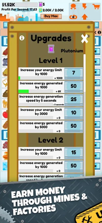 ● Spend energy points to buy global upgrades that improve all mines and farms